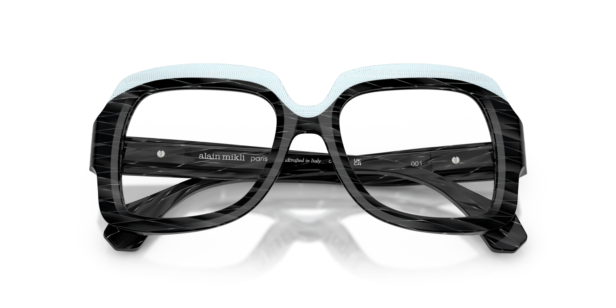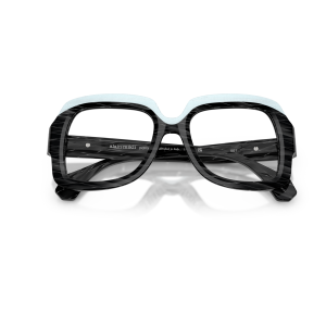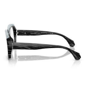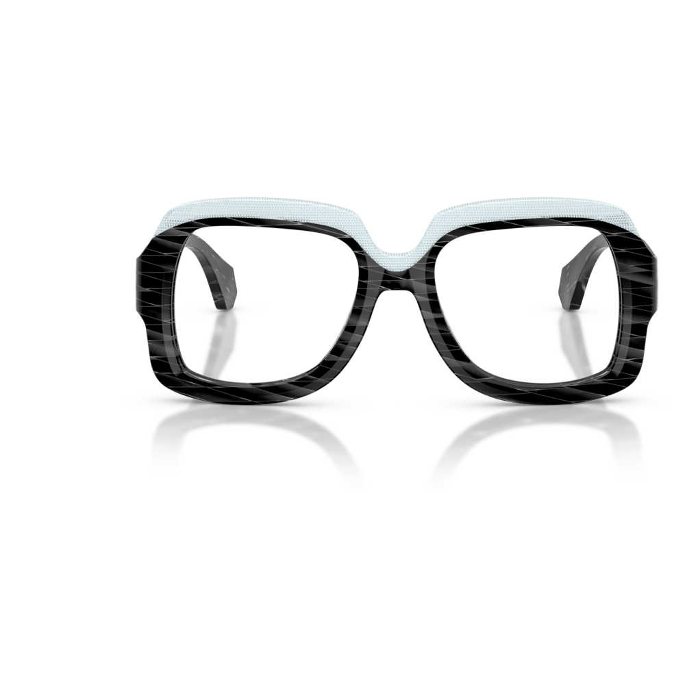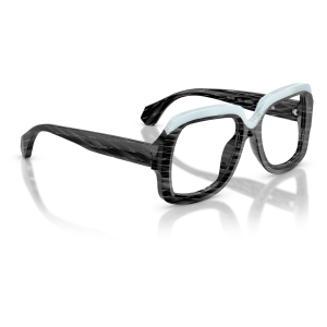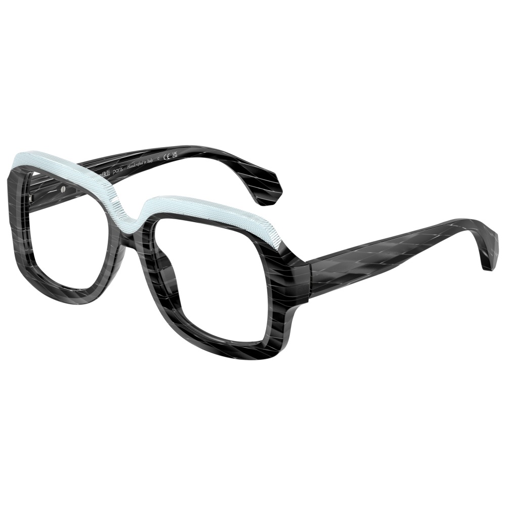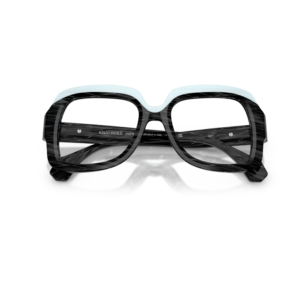 Alain mikli 3533 vista 001 è un occhiale da vista dalla montatura squadrata, costruito in acetato e caratterizzato da un deciso gioco grafico tra volumi e superfici. Il frontale nero mostra una lavorazione a righe oblique tono su tono che attraversa cerchi oculari e aste, mentre la parte superiore è evidenziata da un inserto azzurro chiaro texturizzato che segue il sopracciglio e crea un contrasto netto. Le lenti demo sono trasparenti, pensate per il montaggio di lenti correttive personalizzate. Il ponte scolpito accentua l’andamento geometrico del frontale, mentre le aste larghe proseguono il motivo inciso con terminali sfaccettati. All’interno dell’asta è visibile la firma alain mikli paris con la dicitura handcrafted in italy, dettaglio che sottolinea l’identità del modello. Calibro 50 e ponte 18 completano una struttura compatta ma molto presente sul viso.