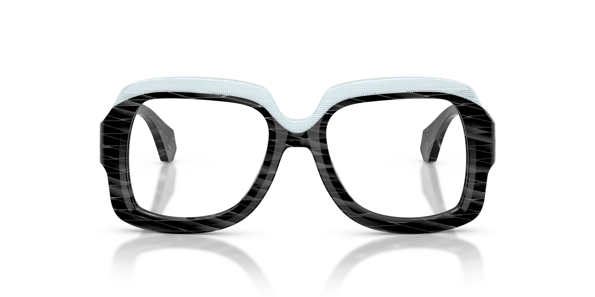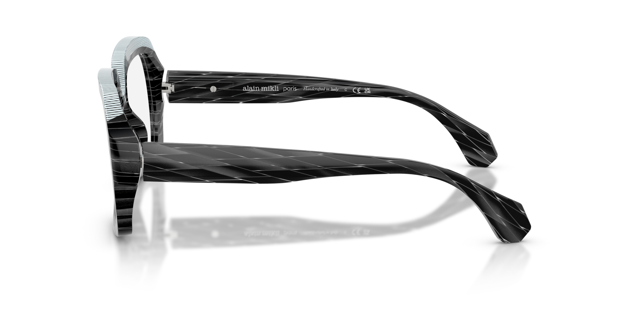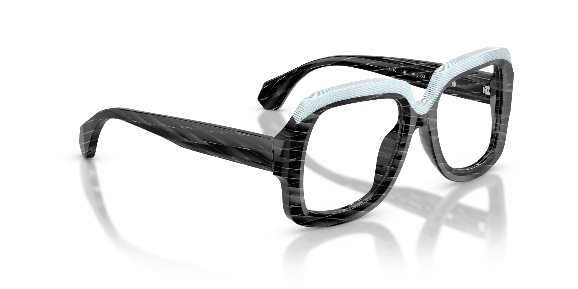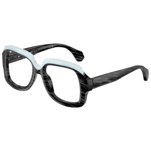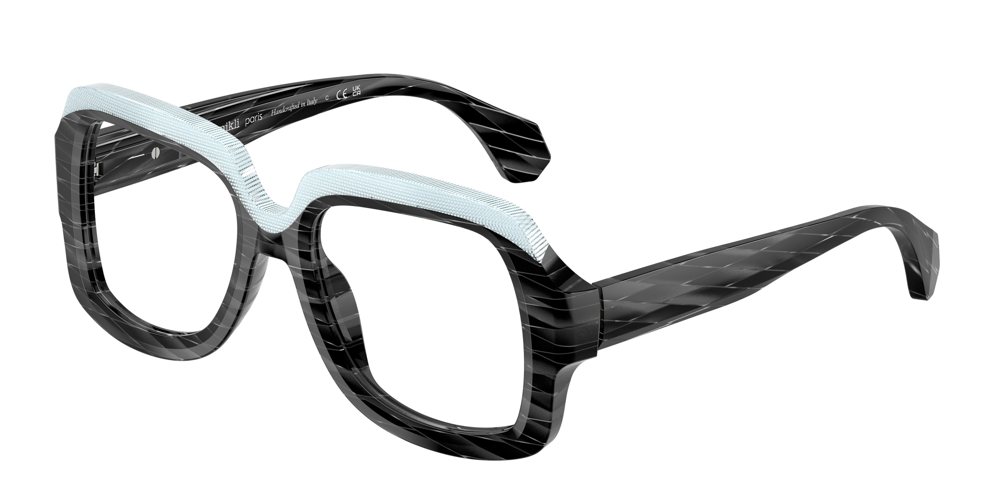 Alain mikli 3533 vista 001 è un occhiale da vista dalla montatura squadrata, costruito in acetato e caratterizzato da un deciso gioco grafico tra volumi e superfici. Il frontale nero mostra una lavorazione a righe oblique tono su tono che attraversa cerchi oculari e aste, mentre la parte superiore è evidenziata da un inserto azzurro chiaro texturizzato che segue il sopracciglio e crea un contrasto netto. Le lenti demo sono trasparenti, pensate per il montaggio di lenti correttive personalizzate. Il ponte scolpito accentua l’andamento geometrico del frontale, mentre le aste larghe proseguono il motivo inciso con terminali sfaccettati. All’interno dell’asta è visibile la firma alain mikli paris con la dicitura handcrafted in italy, dettaglio che sottolinea l’identità del modello. Calibro 50 e ponte 18 completano una struttura compatta ma molto presente sul viso.