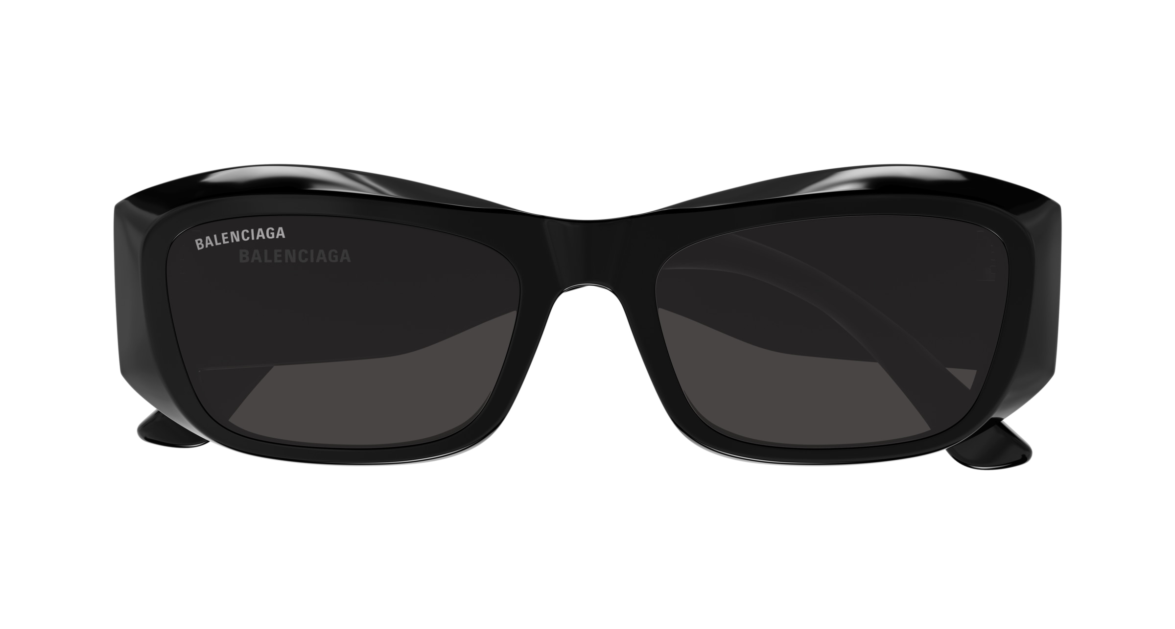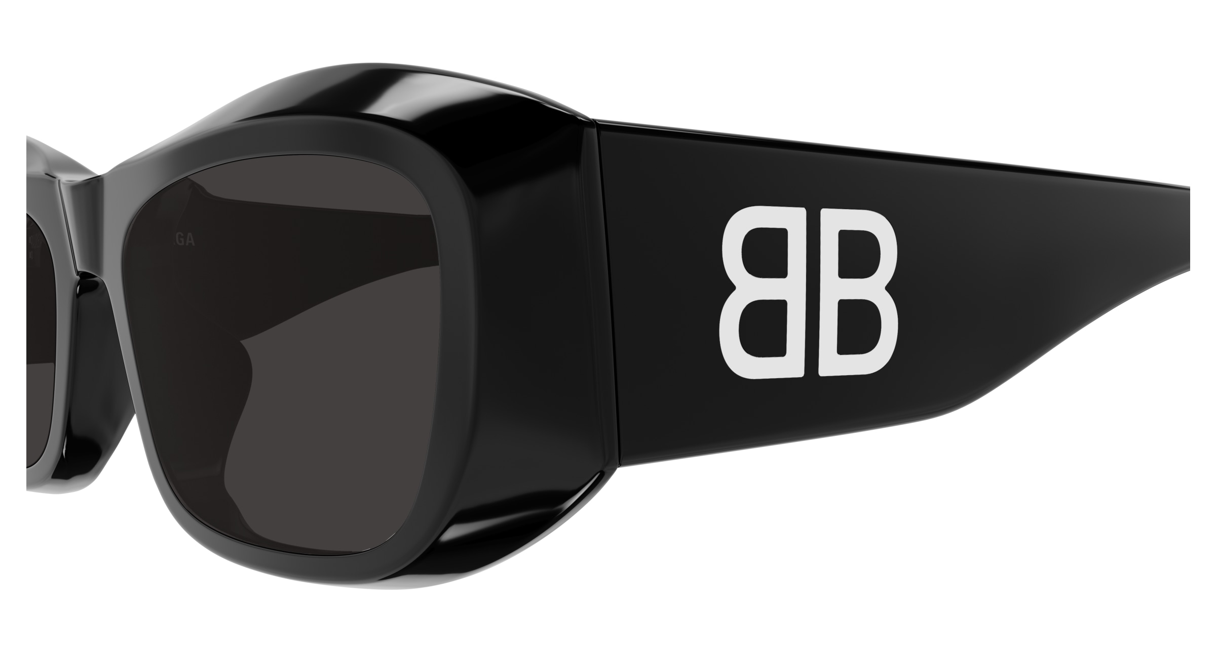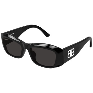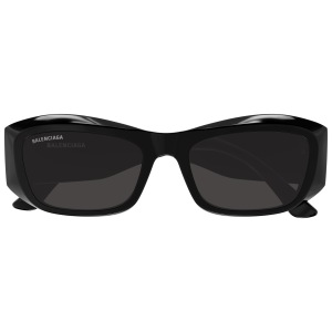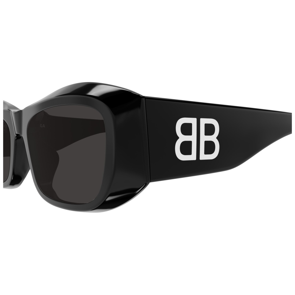 Balenciaga bb0397sa è un occhiale da sole dalla montatura rettangolare in nero lucido, con volumi marcati e linee scolpite che enfatizzano il frontale spesso e avvolgente. Realizzato in acetato riciclato, questo modello abbina una costruzione decisa a lenti grigio scuro che rafforzano l’impatto monocromatico della variante 001 black black grey. Le aste larghe diventano un elemento centrale del design: sul lato spicca il maxi logo bb bianco a contrasto, mentre il logo balenciaga compare in bianco anche sul lato esterno del frontale e all’interno dell’asta. Il calibro 54 e il ponte da 19 mm definiscono proporzioni equilibrate, pensate per una presenza netta sul viso. La silhouette rettangolare, compatta e pronunciata, richiama un’estetica contemporanea tipica del brand, con superfici ampie e profilo bold.