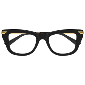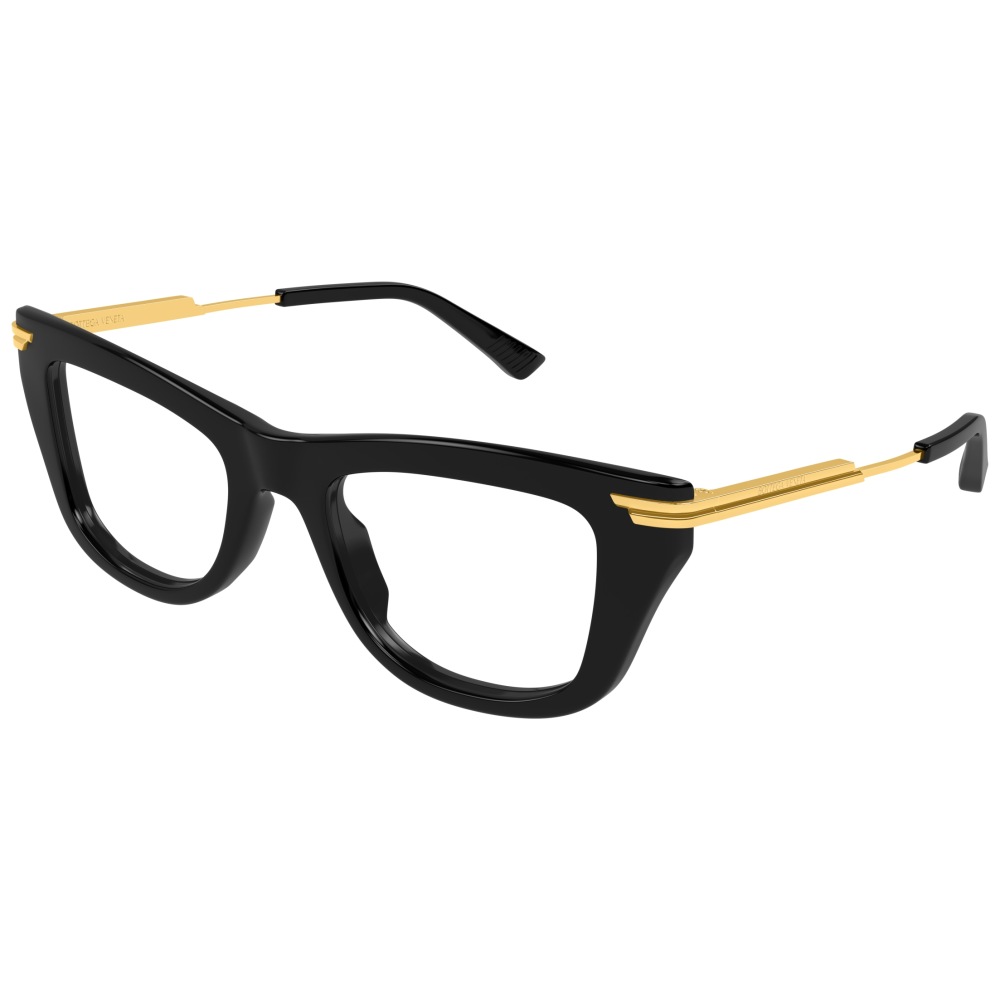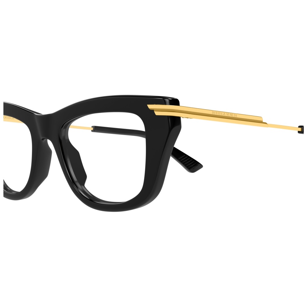 Bottega veneta bv1370o è un occhiale da vista dalla forma rettangolare decisa, con frontale nero in acetato riciclato che scolpisce lo sguardo con profili spessi e linee nette. La colorazione 001 black gold transparent combina il nero lucido della montatura con aste sottili in metallo color oro, creando un contrasto grafico molto riconoscibile. Le lenti demo trasparenti mettono in evidenza l’architettura del frontale e sono pensate per la personalizzazione con lenti correttive. Sulle aste spicca il logo bottega veneta inciso sul metallo dorato, mentre vicino alle cerniere compare un dettaglio metallico stratificato che richiama il linguaggio stilistico del marchio. I terminali neri in acetato riprendono il colore del frontale e completano la struttura con continuità visiva. Il calibro 50 e il ponte 20 definiscono proporzioni equilibrate e contemporanee.