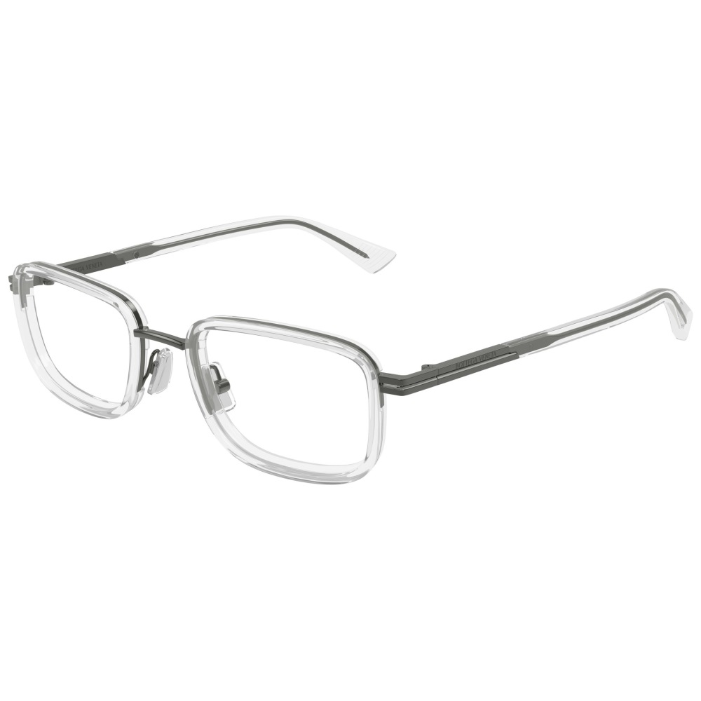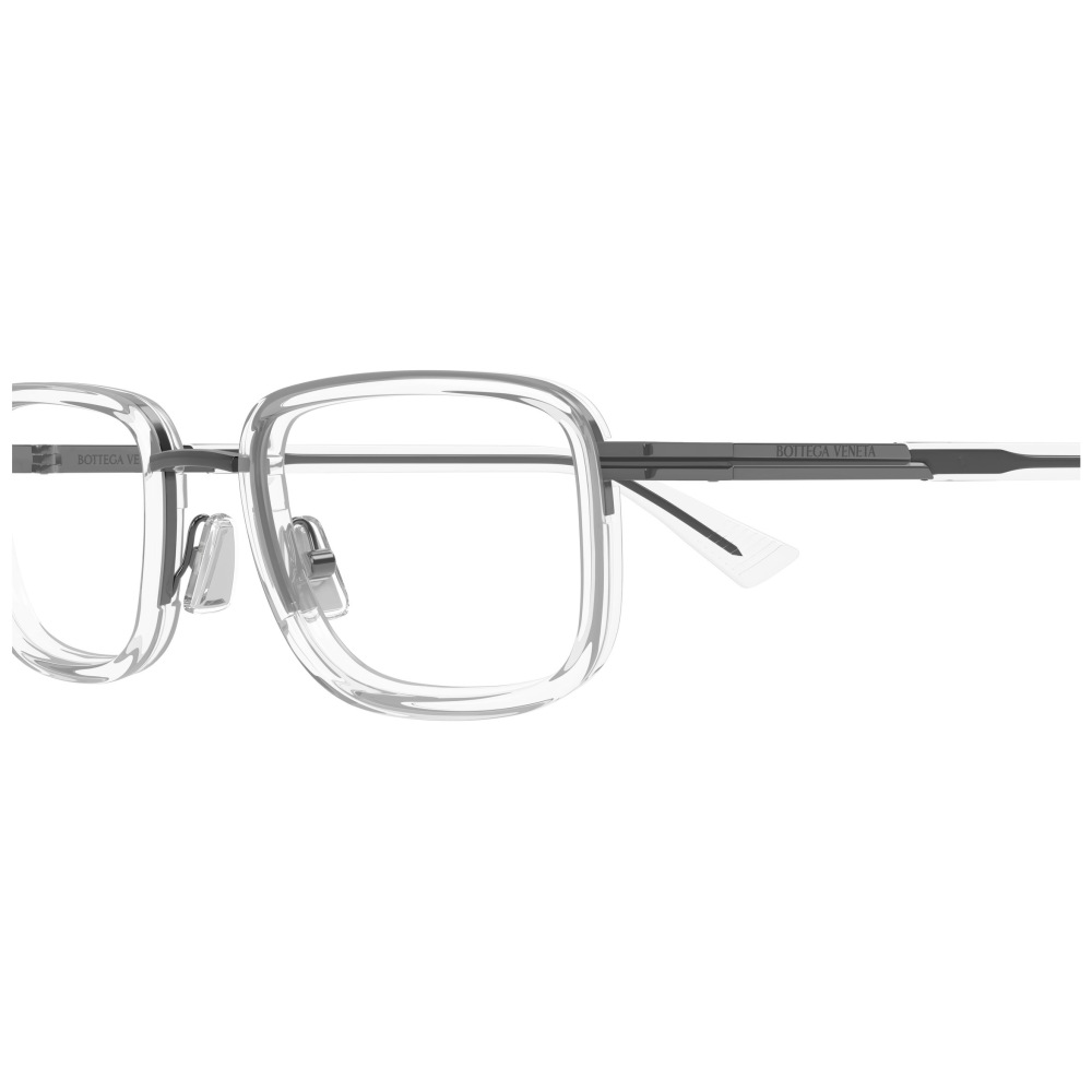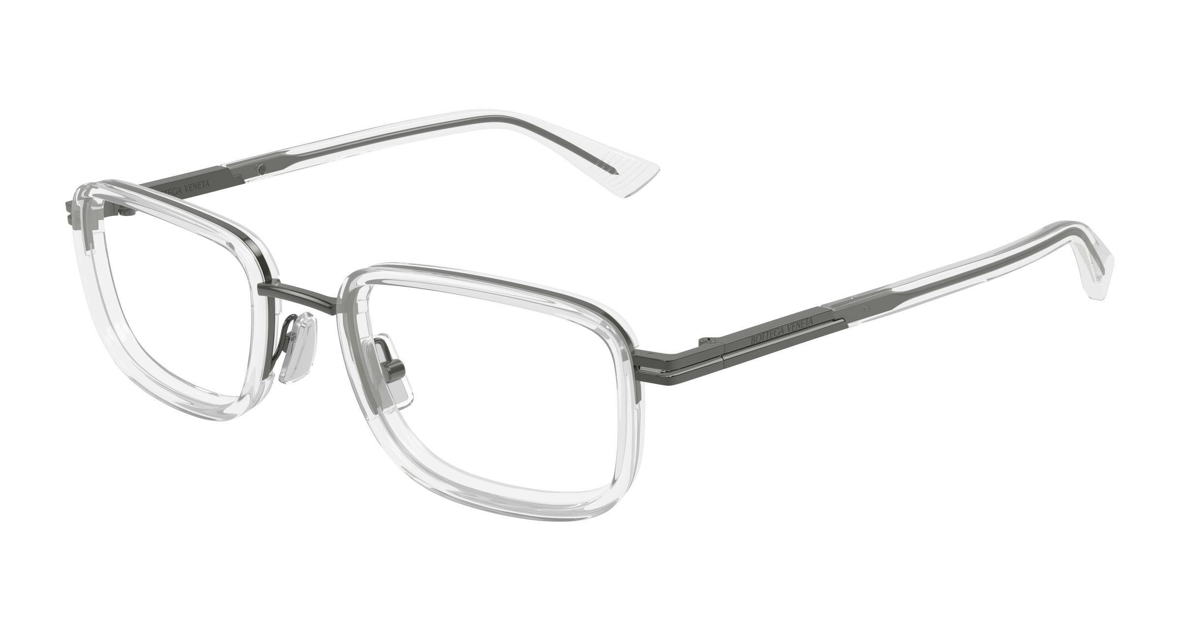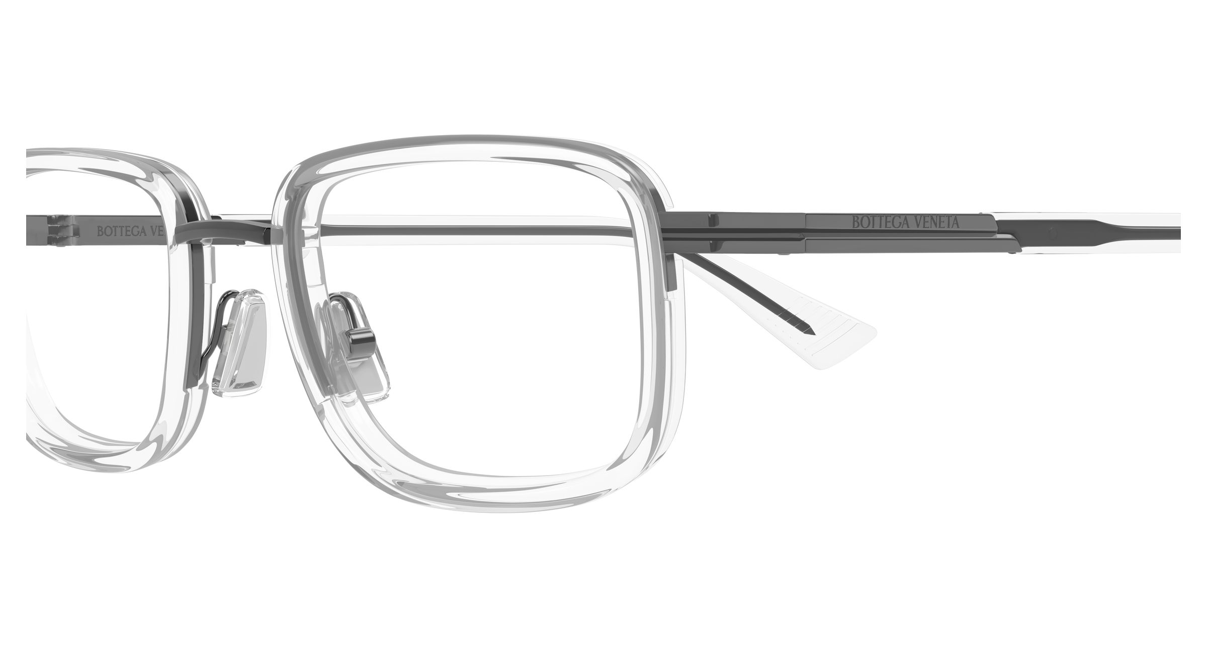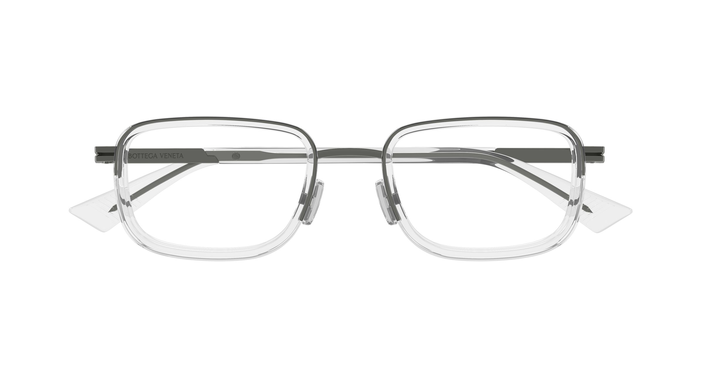 Bottega veneta bv1464o è un occhiale da vista dalla forma rettangolare ampia, con frontale trasparente che lascia emergere la struttura interna in finitura ruthenium. La montatura combina il volume dell’acetato crystal con un’anima in metallo, creando un effetto tecnico e pulito molto riconoscibile su questo modello. Le lenti demo sono trasparenti, pensate per la sostituzione con lenti correttive personalizzate. Il ponte e il profilo interno in tonalità canna di fucile definiscono il disegno geometrico del frontale, mentre i naselli regolabili assicurano una calzata più precisa. Le aste sottili in metallo riprendono la finitura ruthenium e presentano il logo bottega veneta inciso all’esterno. I terminali trasparenti, con dettaglio interno visibile e motivo lineare, completano il design con continuità materica e un’estetica essenziale ma strutturata. Calibro 53 e ponte 21.