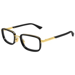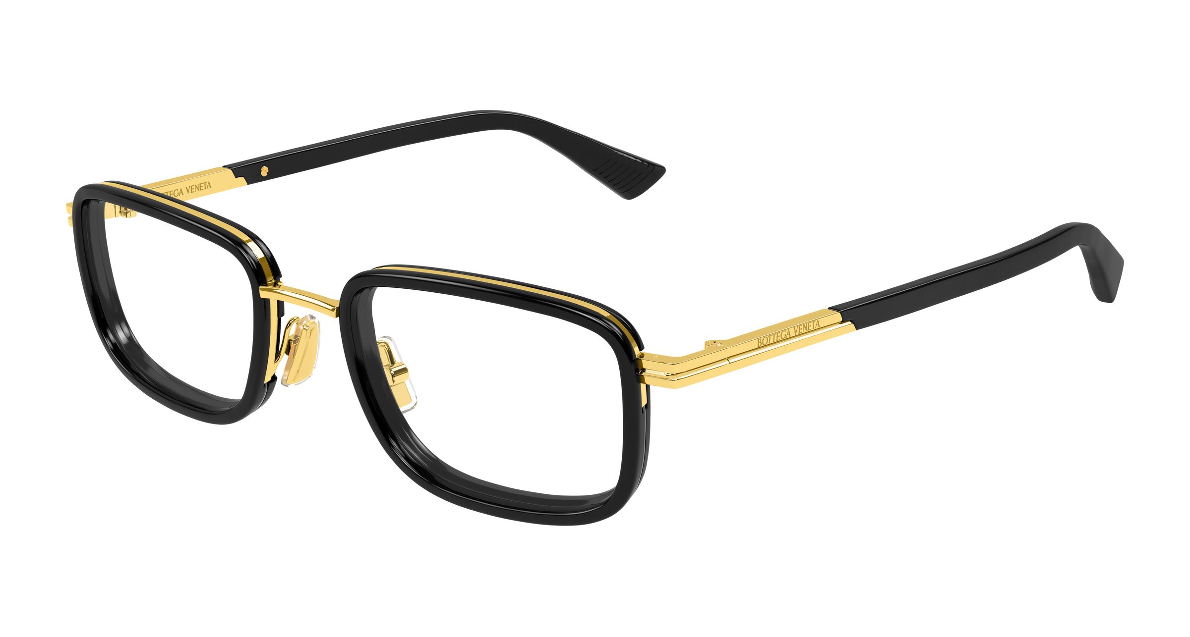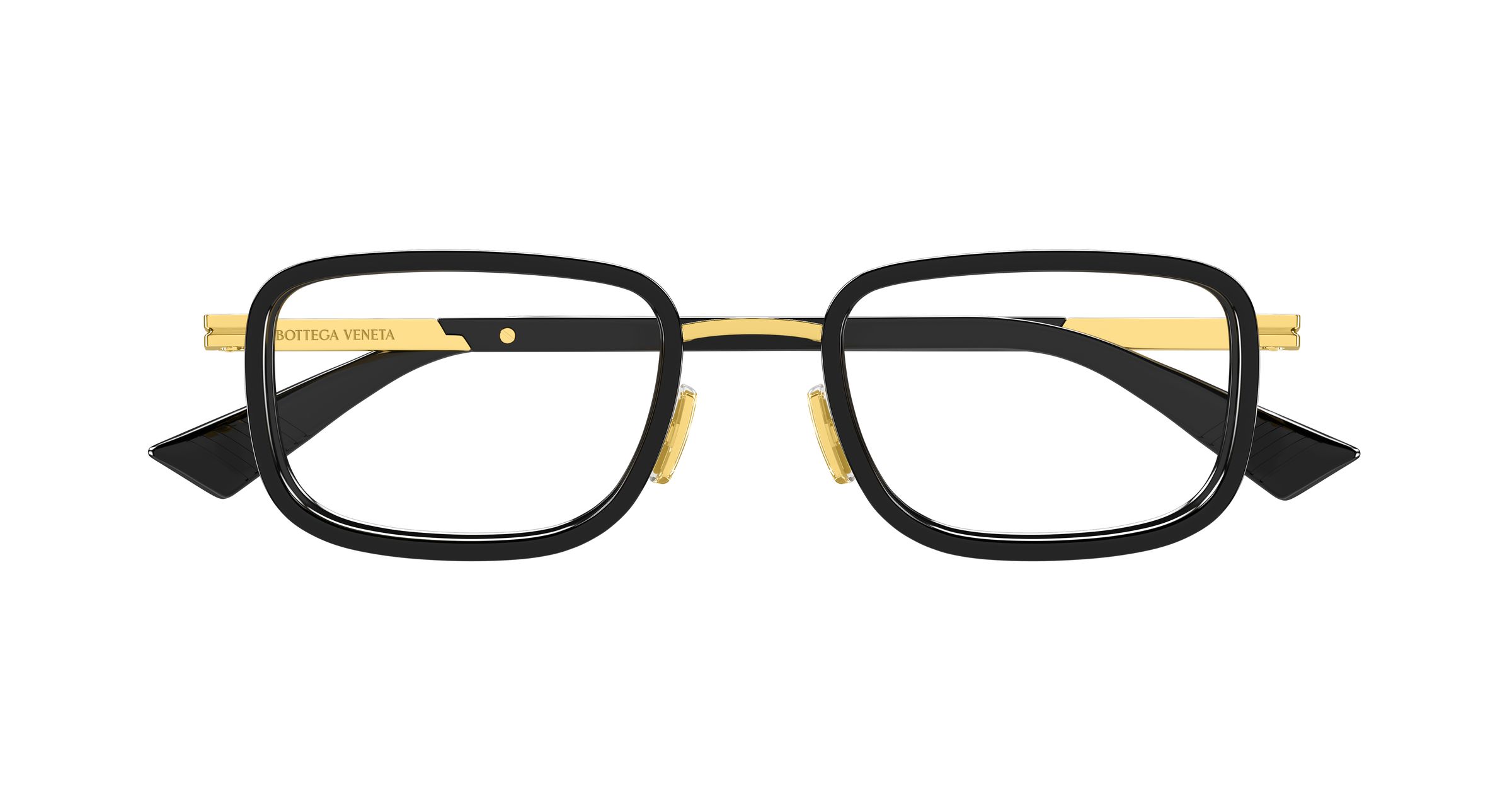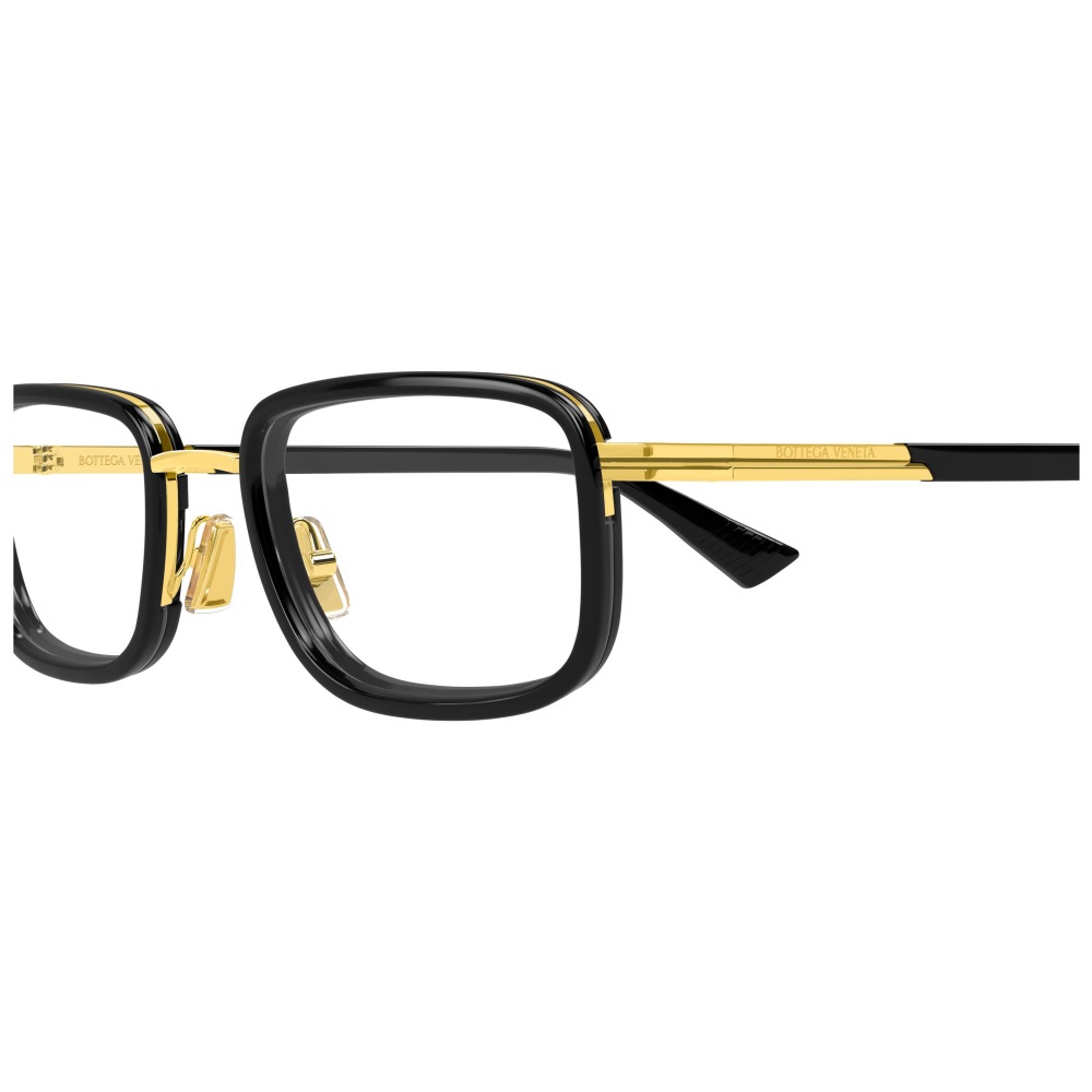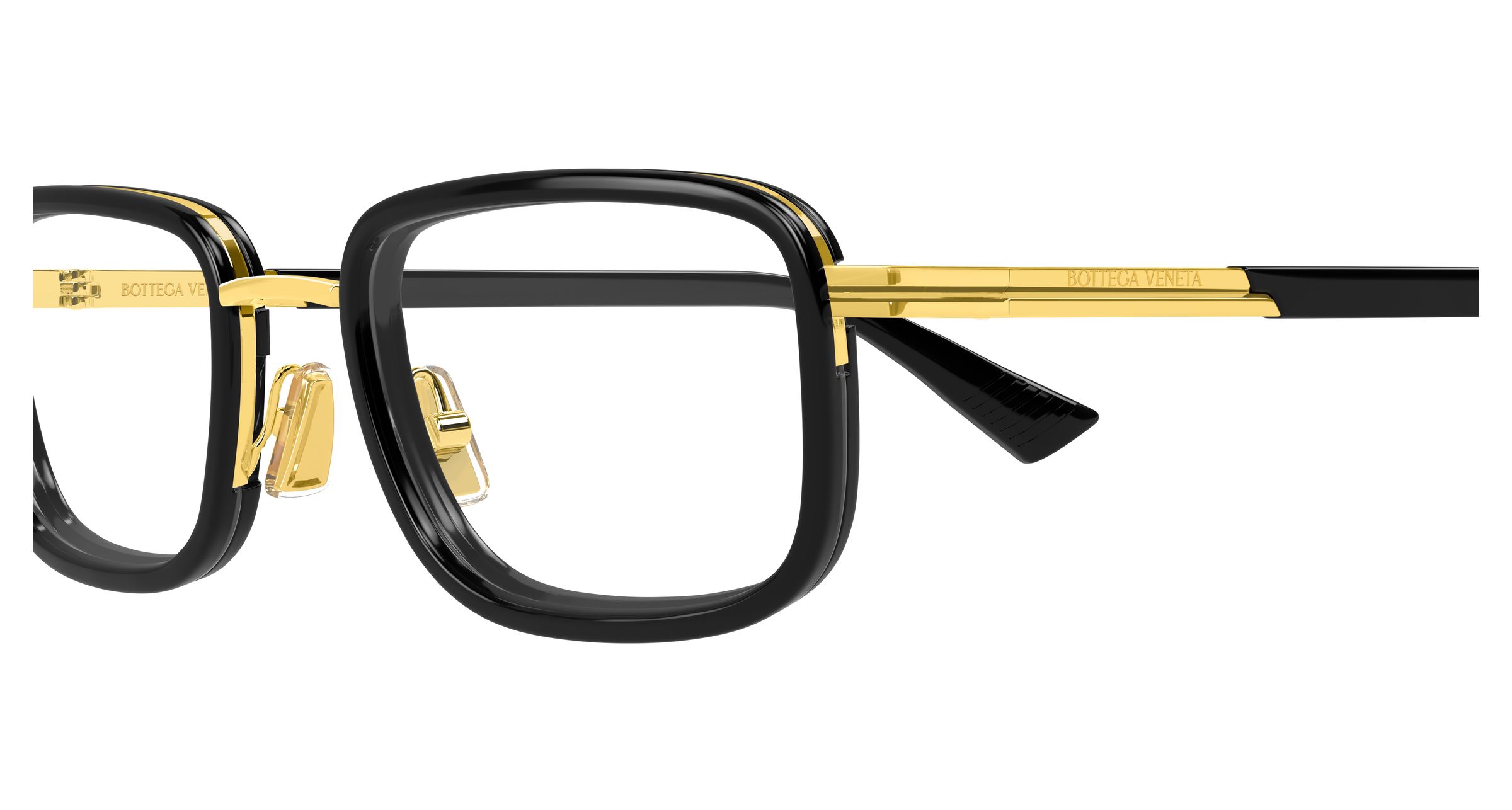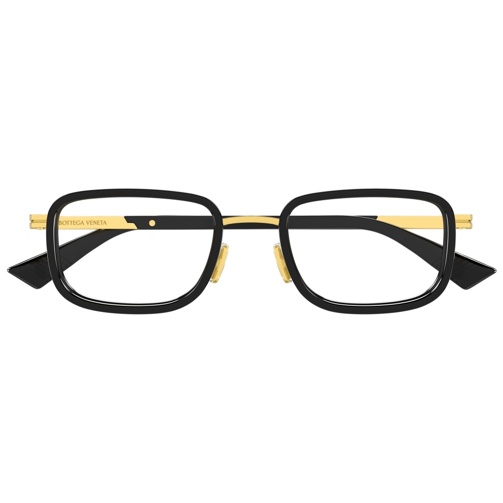 Bottega veneta bv1464o è un occhiale da vista con montatura rettangolare dal profilo deciso, proposta in una combinazione di nero e oro che mette in evidenza la costruzione a doppio livello del frontale. La parte esterna in nero incornicia il bordo metallico interno color oro, creando un contrasto netto e molto riconoscibile. La montatura è realizzata in metallo, con naselli regolabili che alleggeriscono l’impatto visivo della struttura e migliorano la vestibilità. Le lenti demo trasparenti mantengono il design pulito e tecnico del modello. Le aste sottili in metallo color oro presentano il logo bottega veneta inciso all’esterno, mentre i terminali neri aggiungono continuità cromatica con il frontale. Il ponte da 21 mm e il calibro 53 mm completano una silhouette ampia e ben bilanciata, adatta a chi cerca linee geometriche marcate con dettagli costruttivi in evidenza.