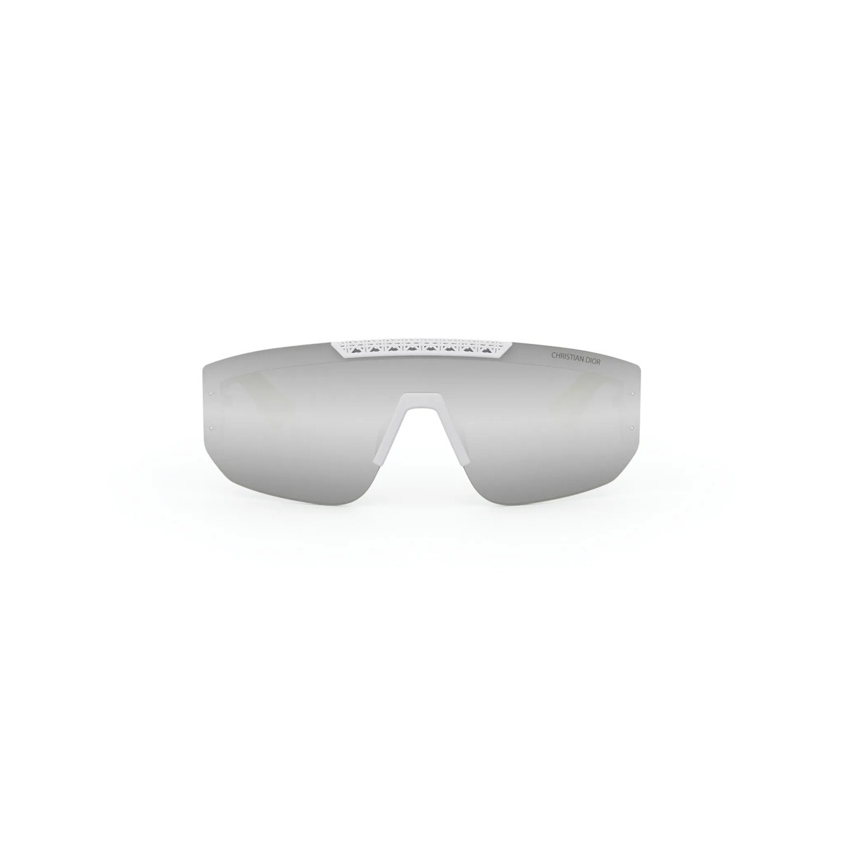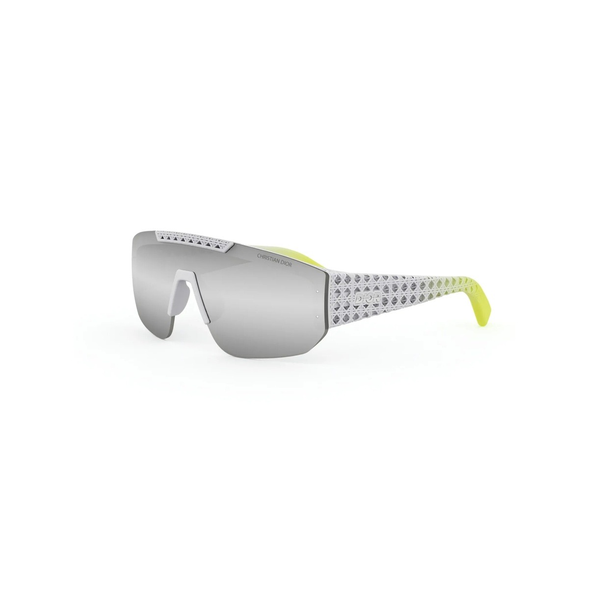 Dior man dior3d m2u è un occhiale da sole con montatura rettangolare a mascherina, caratterizzato da un impatto grafico molto netto e da una struttura visivamente continua. Il colore principale della montatura è bianco, evidente nelle aste traforate con motivo tridimensionale e nei naselli integrati, mentre i terminali sfumano in un acceso giallo fluo che aggiunge un contrasto tecnico e sportivo. Le lenti sono grigie con effetto specchiato argento, in un’unica schermatura avvolgente che copre l’intero frontale. Sulla parte alta della lente compare la firma christian dior, discreta ma ben visibile, mentre sulle aste spicca il logo cd inserito nel disegno geometrico traforato. Il profilo sottile del frontale e la lavorazione openwork laterale rendono questo modello immediatamente riconoscibile, con un’estetica futuristica e leggera.
