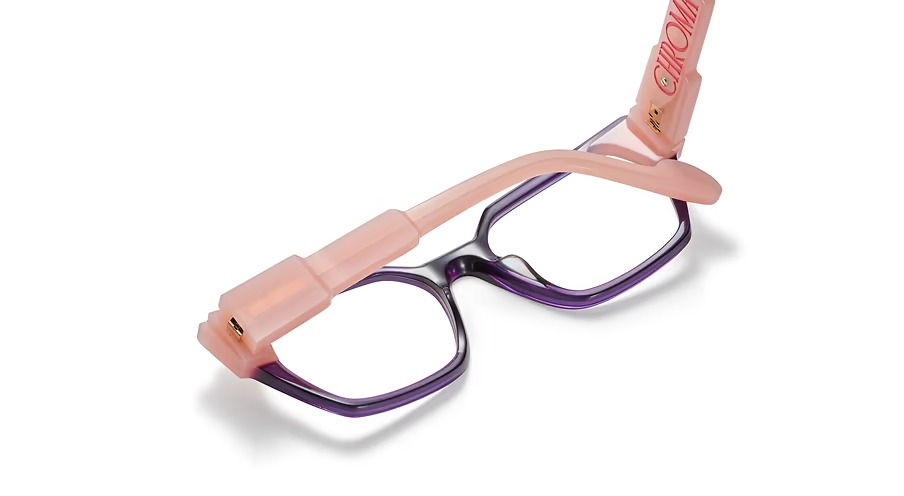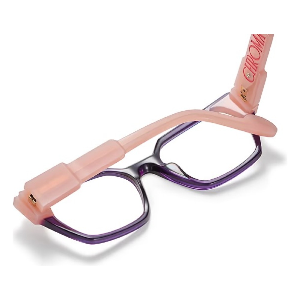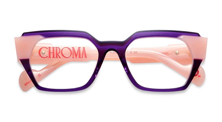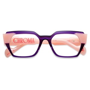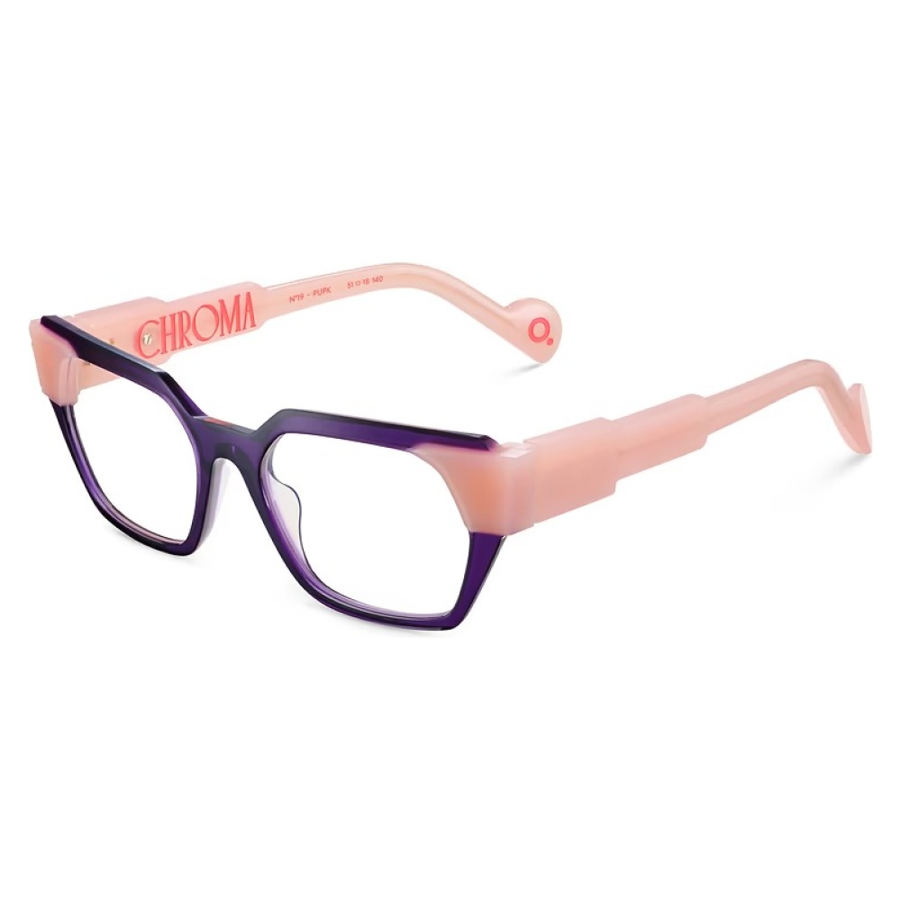Etnia barcelona chroma n19 51o è un occhiale da vista dalla montatura rettangolare, costruita in acetato con un deciso contrasto cromatico tra il frontale viola intenso e le aste rosa traslucido. Il colore principale della montatura è rosa, valorizzato da un gioco di sfumature che rende il modello immediatamente riconoscibile. Le lenti demo sono trasparenti, pensate per essere sostituite con lenti correttive personalizzate. Il frontale presenta profili netti e spessori ben visibili, con una costruzione che sottolinea il taglio geometrico della forma. Sulle aste spicca la scritta chroma in rosso, elemento grafico molto evidente che richiama direttamente la linea del modello, mentre il terminale mostra un piccolo dettaglio circolare a contrasto. Con calibro 51 e ponte 18, questa versione pupk combina volumi marcati e una palette vivace tipica dell’approccio creativo di etnia barcelona.