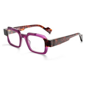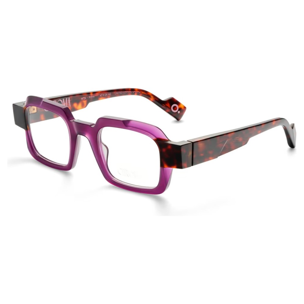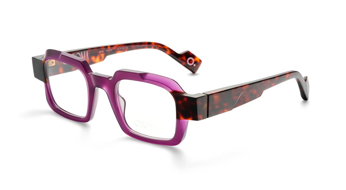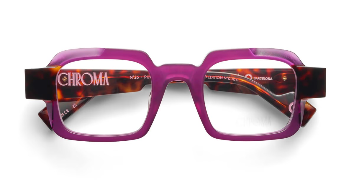 Etnia barcelona chroma n26 47o è un occhiale da vista dalla linea rettangolare decisa, con frontale in acetato rosa traslucido che mette in evidenza il disegno geometrico del ponte e del sopracciglio. La costruzione è spessa e scolpita, con volumi netti che accentuano il carattere architettonico del modello. Le aste, anch’esse in acetato, creano un contrasto materico e cromatico grazie alla finitura tartarugata scura, visibile anche nella parte interna, per un effetto bicolore molto riconoscibile. Le lenti demo sono trasparenti, pensate per il montaggio di lenti correttive personalizzate. Sulla parte interna dell’asta si leggono la sigla del modello e la dicitura limited edition, mentre il terminale mostra il dettaglio circolare distintivo del brand. Il calibro 47 e il ponte da 24 mm definiscono un assetto compatto, con presenza marcata sul viso e proporzioni ben bilanciate.