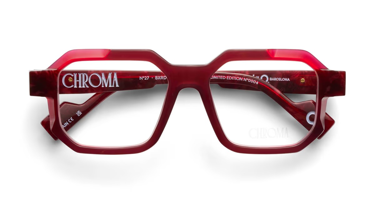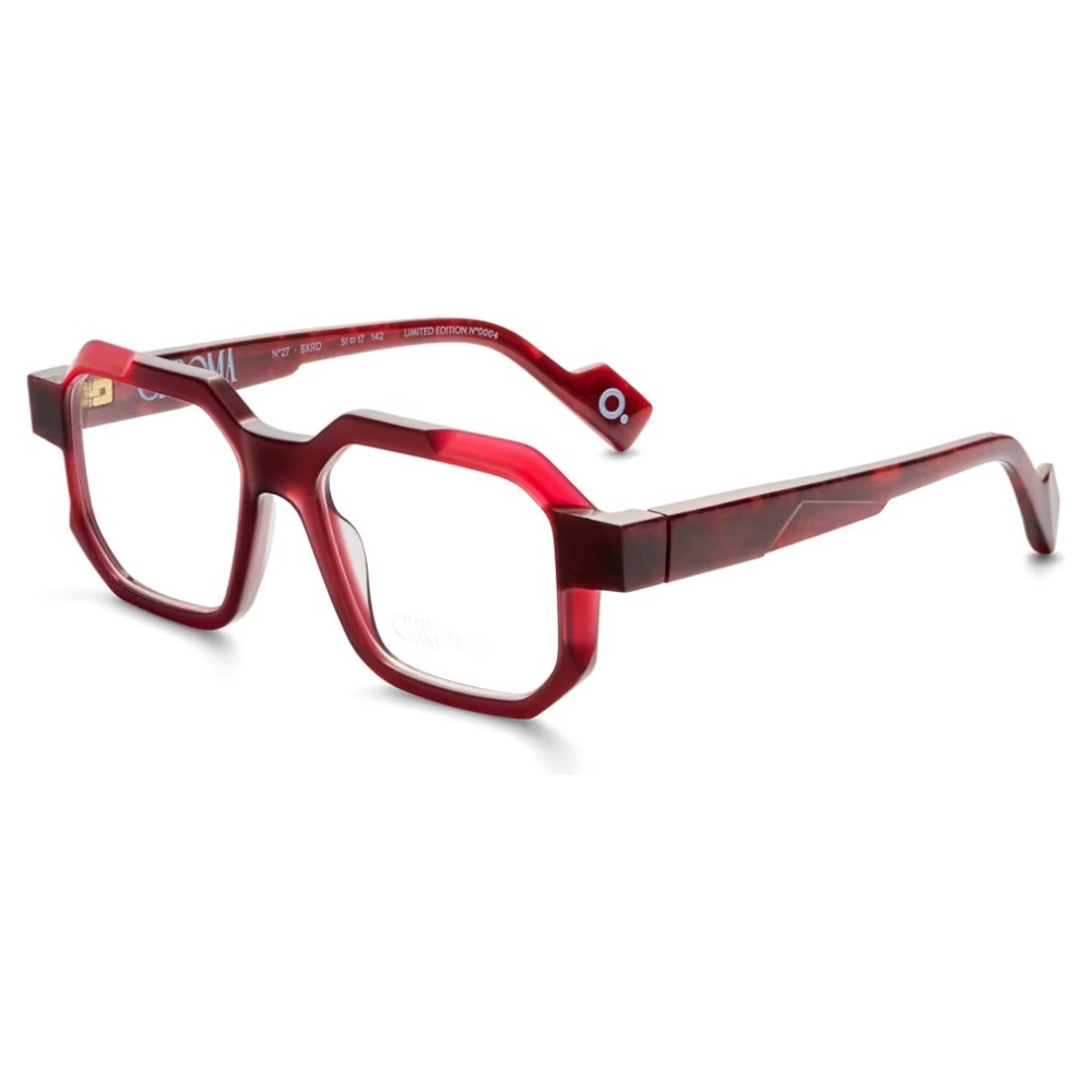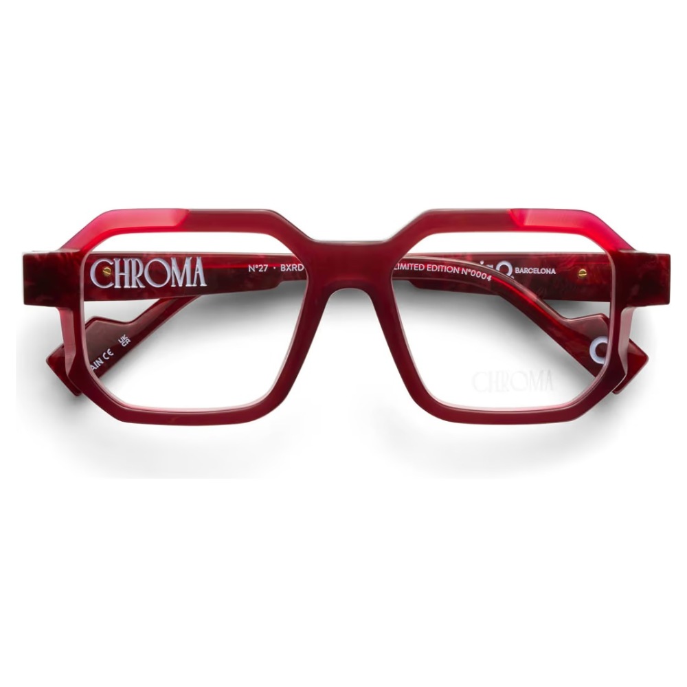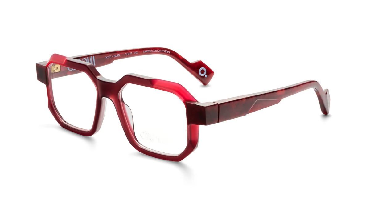 Etnia barcelona chroma n27 51o è un occhiale da vista dalla montatura squadrata, caratterizzato da un profilo geometrico deciso e da volumi sfaccettati che ne enfatizzano il design architettonico. La montatura in acetato si distingue per la tonalità rossa intensa, con un effetto leggermente traslucido che lascia filtrare la luce sui frontali e lungo le aste, creando profondità visiva. Le lenti demo sono trasparenti, pensate per il montaggio di lenti graduate personalizzate. Il ponte scolpito e i bordi marcati donano al modello una presenza netta sul viso, mentre le aste spesse riprendono lo stesso linguaggio angolare del frontale. All’interno dell’asta sono presenti le indicazioni del modello e della colorazione bxrd, insieme alla dicitura limited edition, mentre sul terminale spicca il dettaglio circolare a contrasto, elemento distintivo del brand. Le misure 50 mm di calibro e 16 mm di ponte completano una struttura compatta e ben proporzionata.