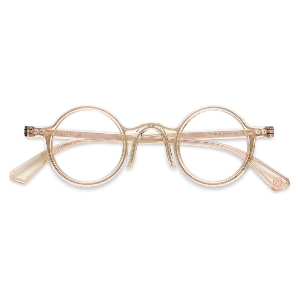 Etnia barcelona guimera 40o è un occhiale da vista con montatura rotonda in acetato trasparente, proposta in una tonalità chiara con leggere sfumature beige che ne alleggeriscono il profilo. Il frontale compatto, abbinato al calibro 40 e al ponte da 29 mm, crea un equilibrio particolare tra volumi pieni e proporzioni ridotte, con un carattere deciso ma molto pulito. Le lenti demo risultano trasparenti, lasciando in evidenza la costruzione del cerchio e del ponte sagomato. Le aste, anch’esse trasparenti, mostrano un’anima interna metallica decorata con motivo inciso visibile attraverso l’acetato, dettaglio distintivo del modello. La zona cerniera è sottolineata da piccoli elementi metallici a vista che aggiungono precisione tecnica al design, mentre il terminale mantiene la stessa finitura cristallina della montatura per un insieme coerente e luminoso.