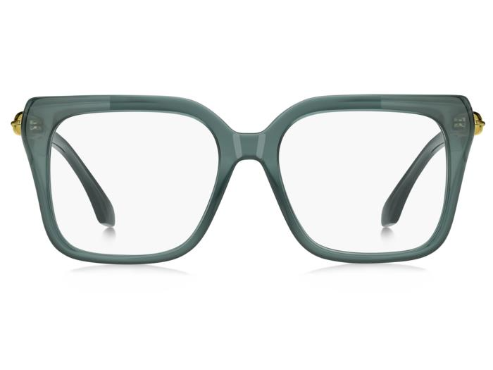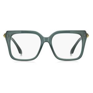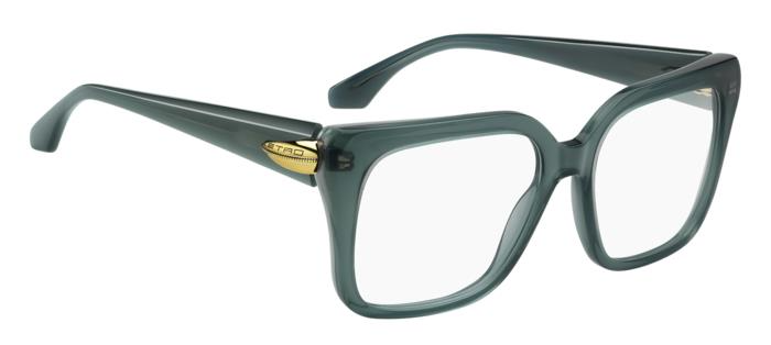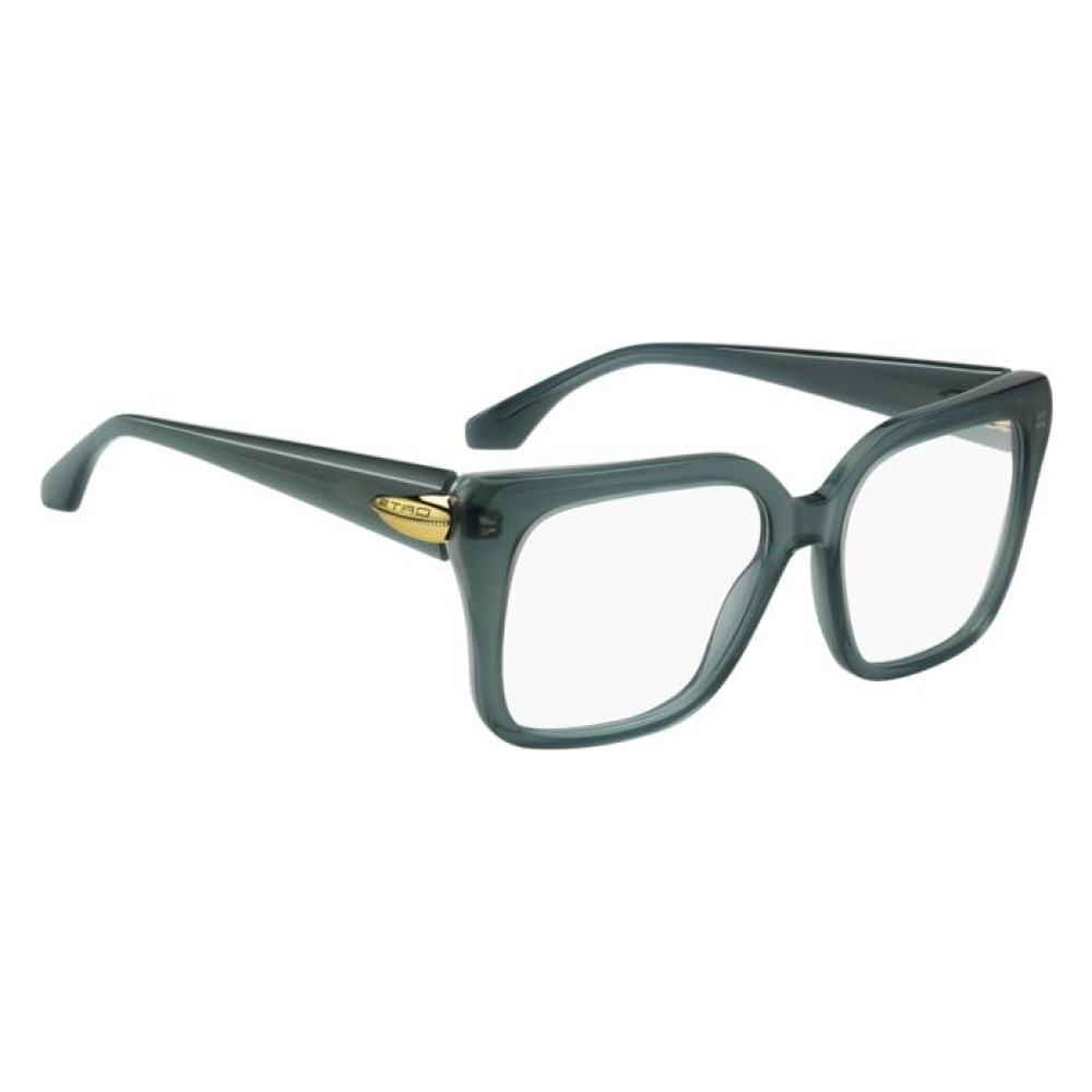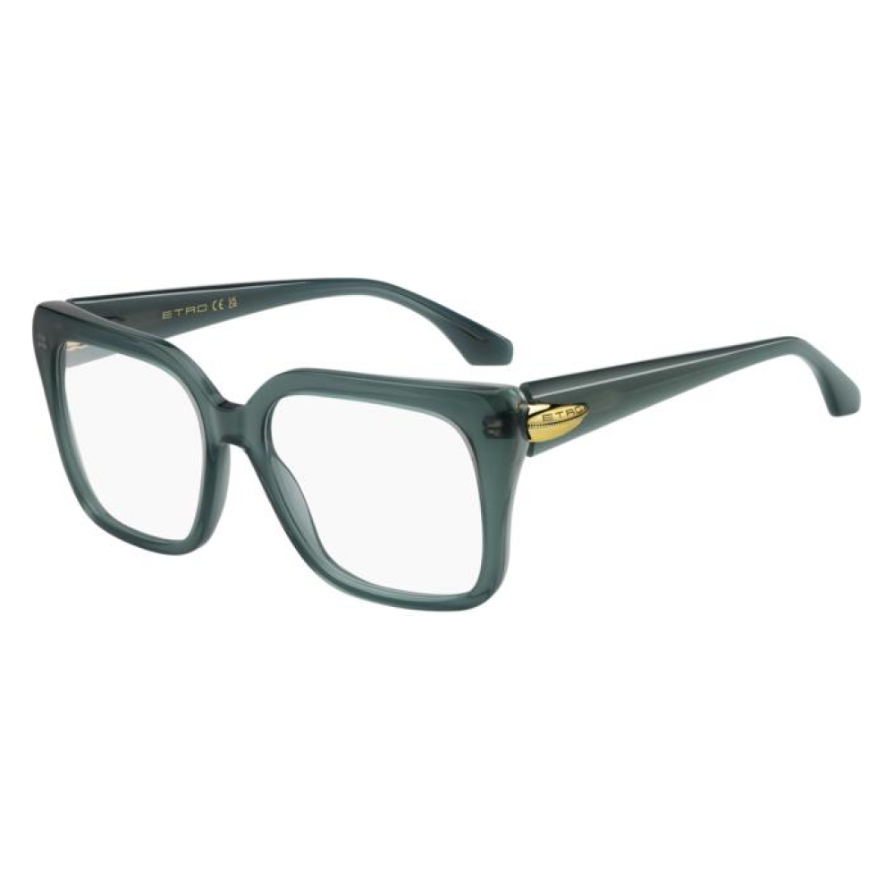Etro etro 0135 è un occhiale da vista dalla montatura squadrata, proposta in una tonalità verde teal traslucida che mette in risalto i volumi pieni del frontale. La costruzione in acetato definisce un profilo deciso ma morbido negli angoli, con cerchi ampi in calibro 53 e ponte da 17 mm che contribuiscono a un assetto visivo equilibrato. Le lenti demo trasparenti lasciano tutta l’attenzione sulla lavorazione della montatura e sulla profondità del colore, che varia leggermente con la luce. Sulle aste spicca un inserto metallico dorato con logo etro, applicato vicino al frontale come dettaglio distintivo e ben visibile di lato. Anche all’interno dell’asta è presente la firma del brand, mentre il terminale in acetato riprende la stessa finitura verde del frontale, creando continuità cromatica nell’intero modello.