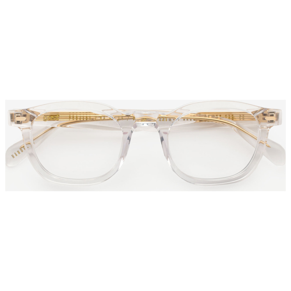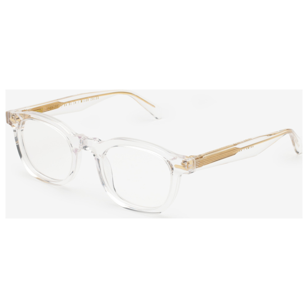 Gast anima crystal presenta una montatura rettangolare in acetato trasparente, con volumi morbidi e profilo ben definito che valorizza il calibro 48 e il ponte da 22 mm. Il frontale crystal lascia intravedere l’anima interna e mette in risalto la costruzione pulita del modello, mentre le lenti demo trasparenti mantengono un aspetto essenziale e luminoso, pensato per l’uso da vista. Le aste, anch’esse trasparenti, rivelano un’anima metallica color oro con lavorazione lineare ben visibile lungo il lato, dettaglio che aggiunge contrasto e struttura al design. Il punto cerniera è marcato da un inserto metallico integrato che si collega visivamente all’interno delle aste, creando continuità tra frontale e profilo laterale. Il risultato è un occhiale da vista dal carattere tecnico e contemporaneo, definito da trasparenze nette e accenti dorati.