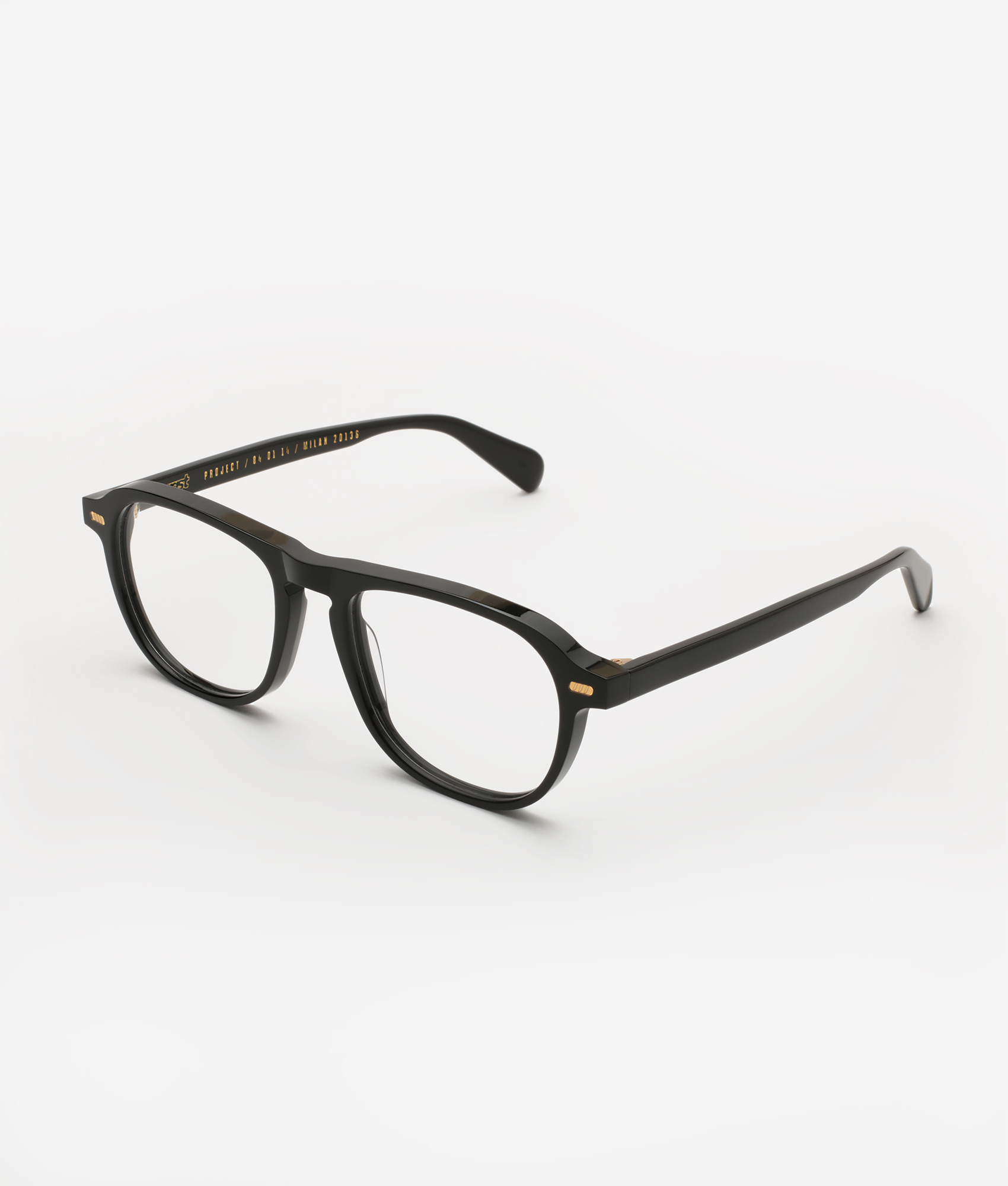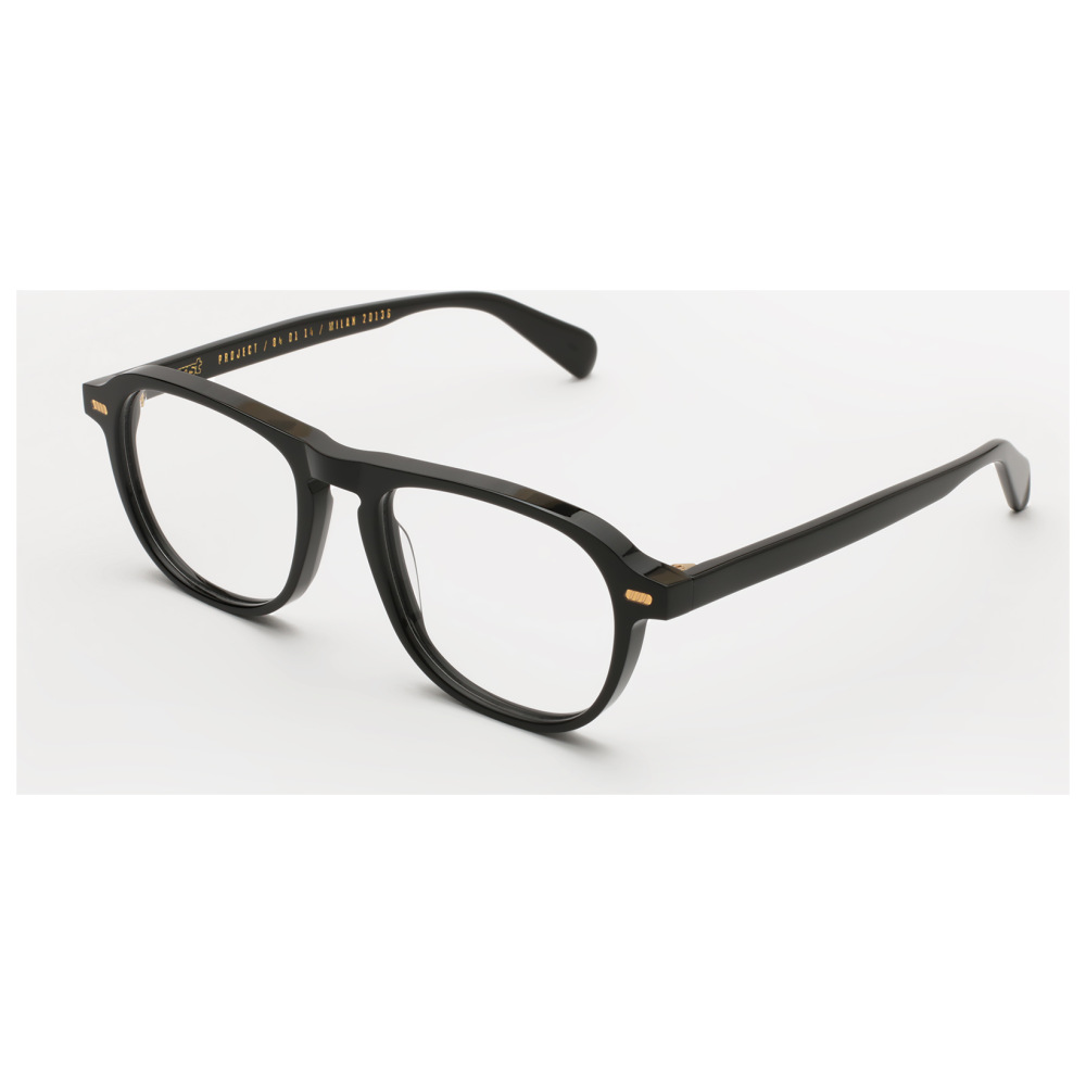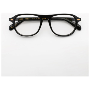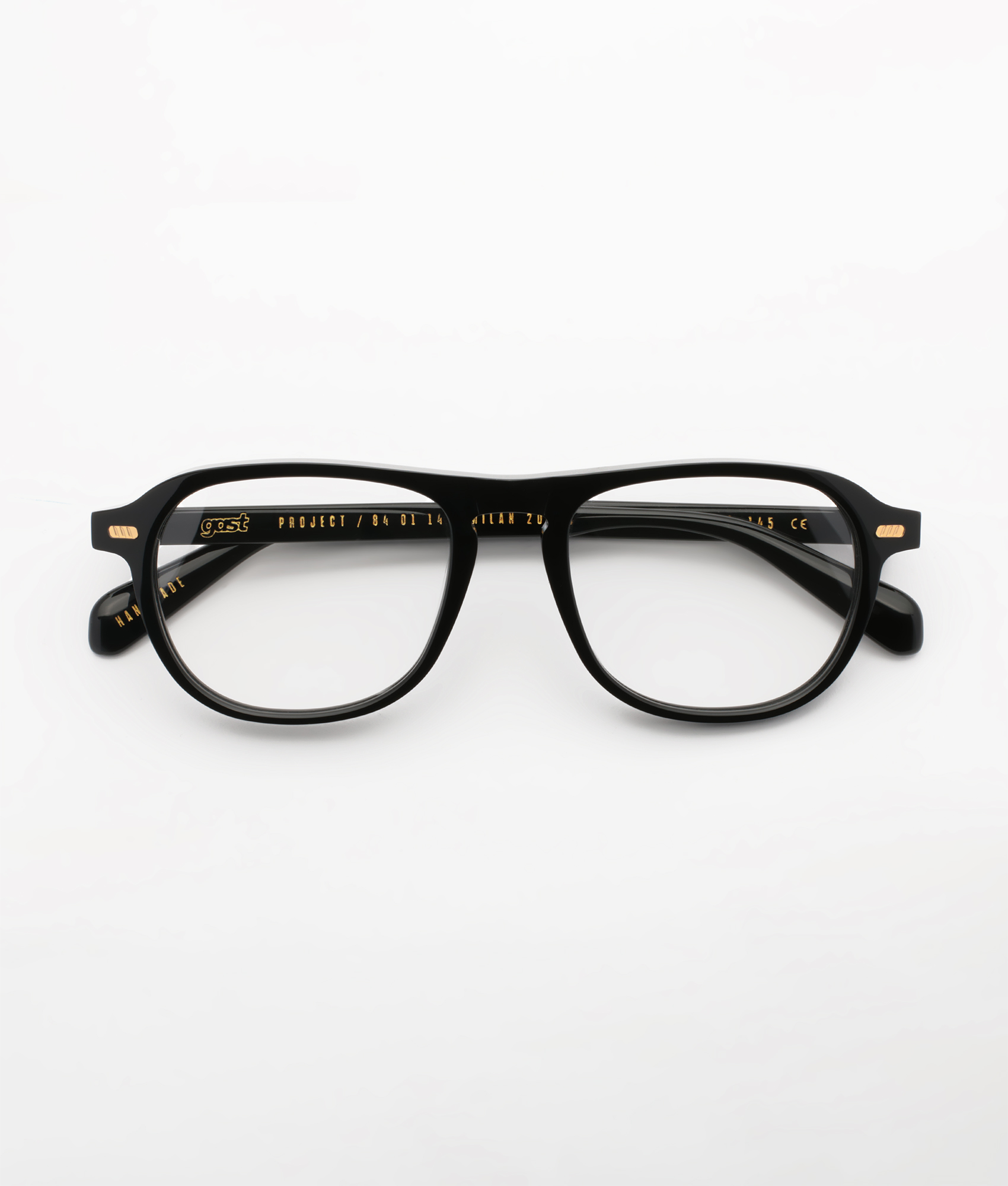 Gast trama black è un occhiale da vista con montatura rettangolare in acetato nero, costruito con linee nette e profilo pieno che definiscono bene il fronte. Il design presenta un ponte sagomato e cerchi leggermente smussati, per una struttura grafica ma equilibrata nelle proporzioni, con calibro 51 e ponte 19. Le lenti demo sono trasparenti, pensate per il montaggio di lenti graduate, e lasciano risaltare il disegno pulito del frontale. Sui lati del frontale compaiono piccoli inserti metallici dorati, ripresi anche in prossimità delle cerniere, dettaglio che crea un contrasto preciso con la finitura nera lucida. Le aste, sottili e affusolate, riportano all’interno la scritta gast e le informazioni del modello in color oro. Un modello da vista dal carattere deciso, con costruzione essenziale e accenti metallici ben visibili.