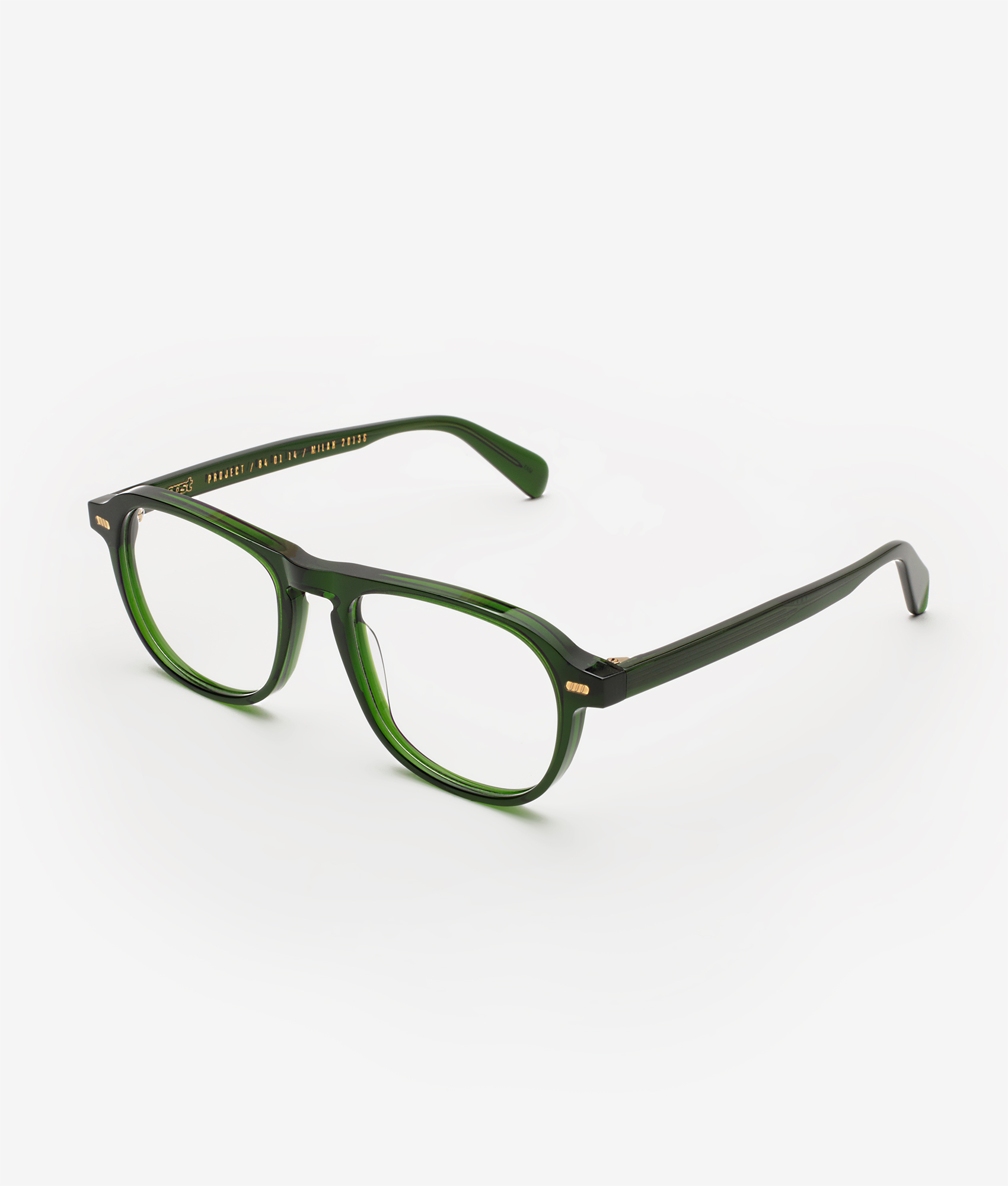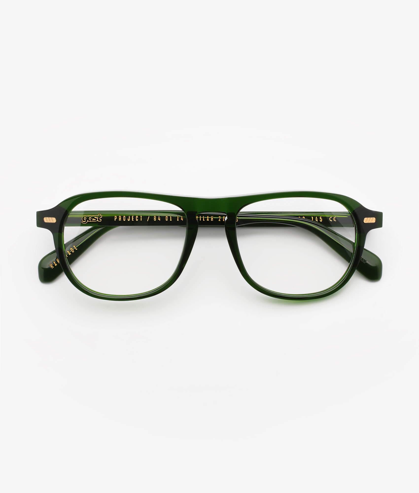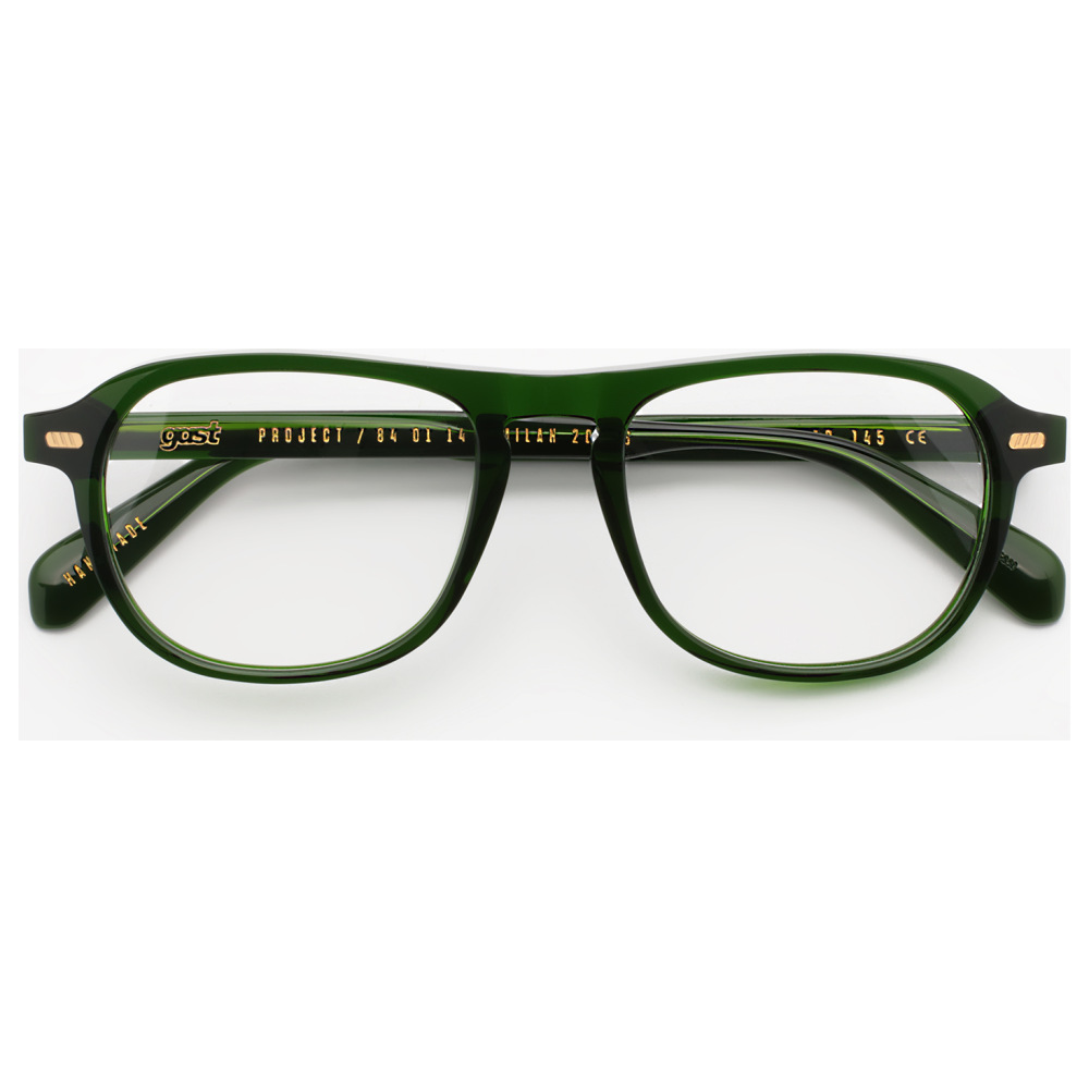 Gast trama pine green è un occhiale da vista con montatura rettangolare in acetato, definita da profili morbidi e volumi netti che alleggeriscono il frontale senza perdere presenza. La tonalità verde pino, intensa e traslucida, lascia filtrare la luce sui bordi creando profondità cromatica e un effetto visivo pulito sulle linee del cerchio e delle aste. Le lenti in demo trasparente mantengono l’aspetto essenziale del modello e mettono in evidenza la struttura del frontale. Sul lato esterno del frontale compaiono piccoli rivetti metallici dorati, ripresi in corrispondenza della cerniera, mentre all’interno dell’asta si notano le scritte del brand e del modello in finitura oro. Il ponte da 19 mm bilancia il calibro da 51 mm, restituendo una proporzione decisa ma versatile, con aste scolpite che seguono il carattere compatto e contemporaneo della montatura.