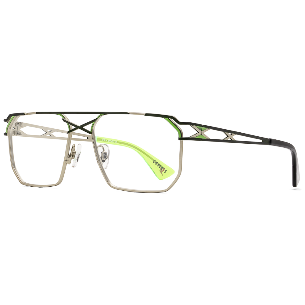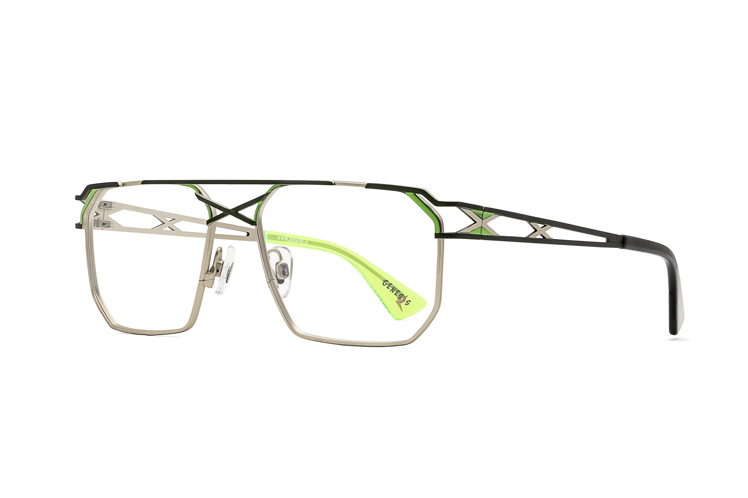 Genesis art gv1640.03-09 è un occhiale da vista con montatura rettangolare in metallo dal design tecnico e molto strutturato. Il colore principale è nero, visibile sul profilo superiore e sulle aste, abbinato a una base metallica chiara e a inserti verdi che sottolineano il frontale e i punti di giunzione. Le lenti in demo sono trasparenti, pensate per il montaggio di lenti correttive personalizzate. Il doppio ponte con incrocio centrale crea un dettaglio grafico distintivo, mentre i naselli regolabili assicurano una vestibilità più precisa. Le aste traforate riprendono il motivo geometrico del frontale con una costruzione aperta e leggera, arricchita da elementi verdi a contrasto. All’interno del terminale spicca la scritta genesis su fondo verde fluo, un dettaglio ben visibile che aggiunge carattere al modello. Calibro 57 e ponte 17 definiscono proporzioni ampie e decise.