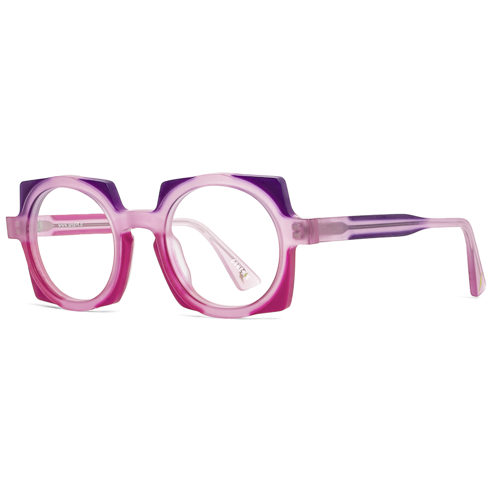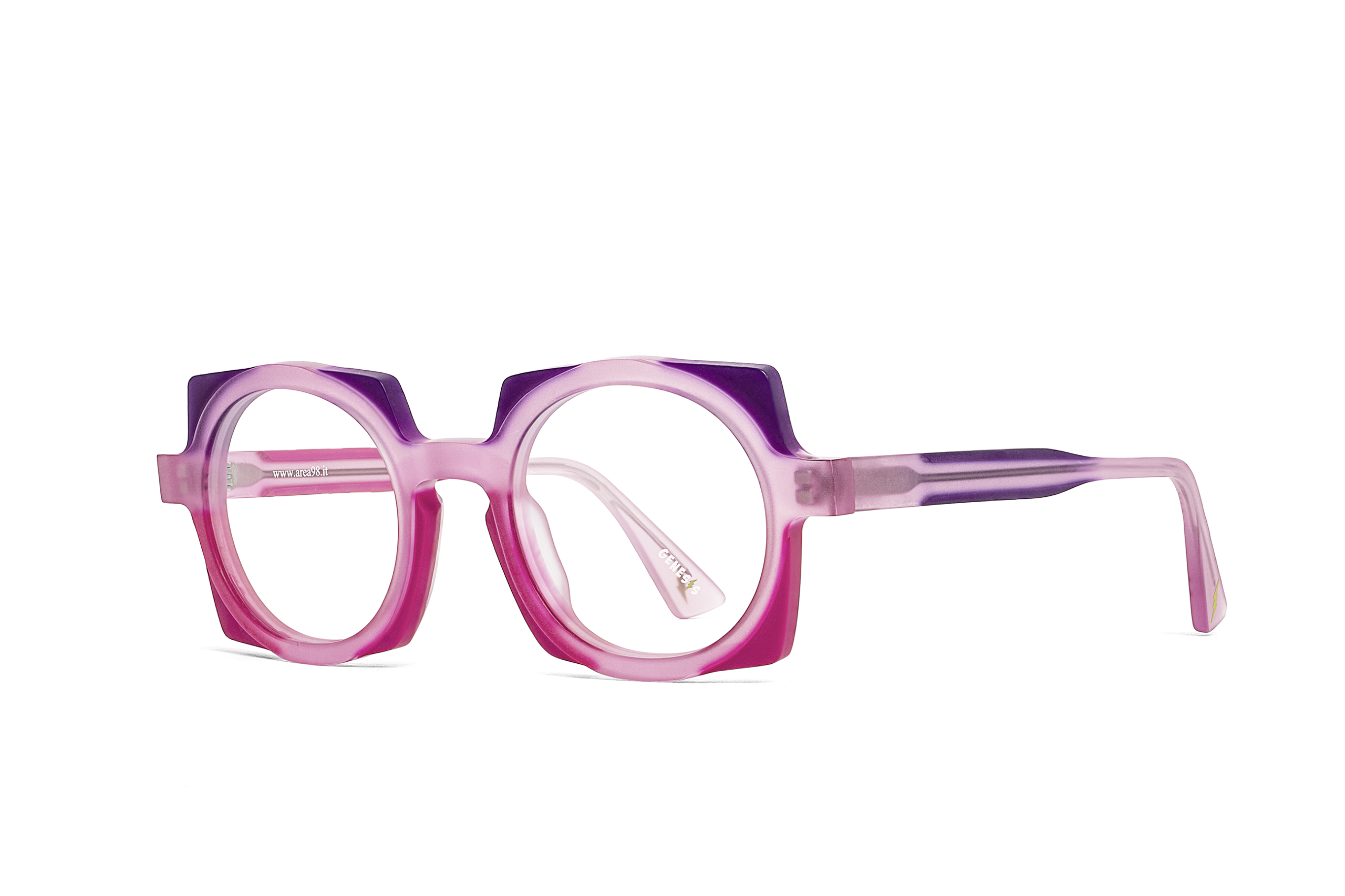 Genesis art gv1647.05-09 presenta una montatura squadrata dal disegno deciso, con profili spessi e volumi scolpiti che ammorbidiscono la geometria grazie agli ampi occhielli interni arrotondati. Il colore principale è rosa, sviluppato in una sfumatura traslucida che passa da toni chiari e cipriati sulla parte superiore a un fucsia più intenso sul frontale inferiore, con aste coordinate e leggere variazioni violacee. La montatura è realizzata in plastica, materiale che valorizza l’effetto pieno del bordo e la resa luminosa della finitura semitrasparente. Le lenti in demo risultano trasparenti, pensate per essere sostituite con lenti correttive. Sull’asta interna è visibile la scritta genesis in bianco, mentre sul terminale compare un piccolo dettaglio grafico a forma di fulmine in tonalità gialla. Il calibro 48 e il ponte 23 contribuiscono a una presenza compatta ma ben bilanciata sul viso.
