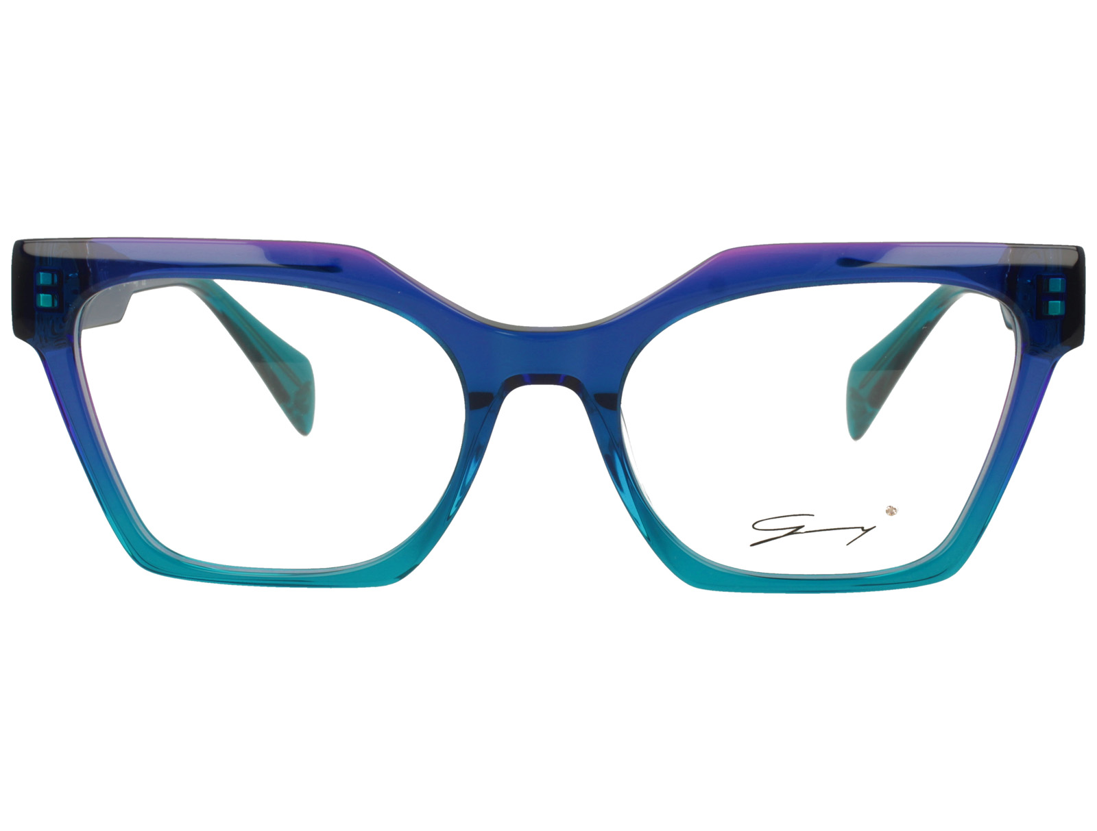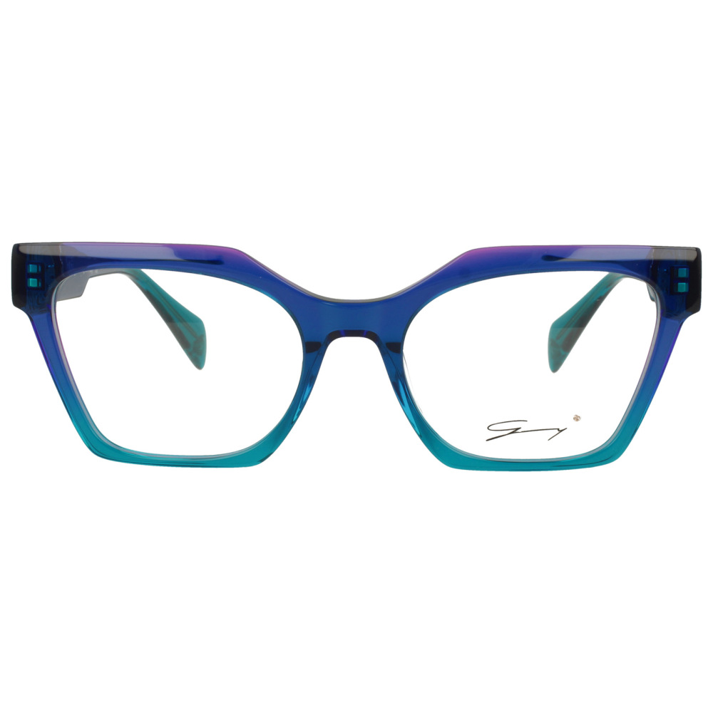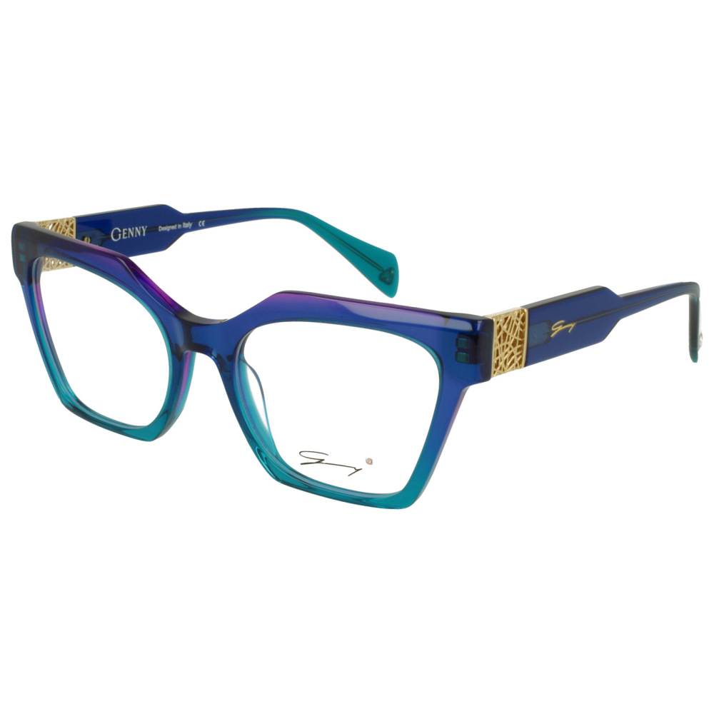 Genny gyv452 02 è un occhiale da vista dalla montatura squadrata, caratterizzato da un deciso gioco cromatico nei toni del blu con sfumature turchesi e riflessi violacei sul fronte. Realizzato in acetate, presenta un profilo pieno e geometrico, con calibro 54 e ponte 19 che ne definiscono una presenza marcata sul viso. Le lenti demo sono trasparenti, pensate per il successivo montaggio di lenti correttive. Il dettaglio più distintivo si trova in prossimità delle cerniere, dove inserti metallici dorati con lavorazione traforata creano un contrasto ricco e strutturato con la trasparenza dell’acetato. Sulle aste spicca il logo genny in finitura dorata, mentre all’interno compare la scritta del brand con l’indicazione designed in italy. I terminali in tonalità verde acqua completano il modello con un accento cromatico netto e riconoscibile.