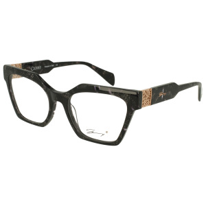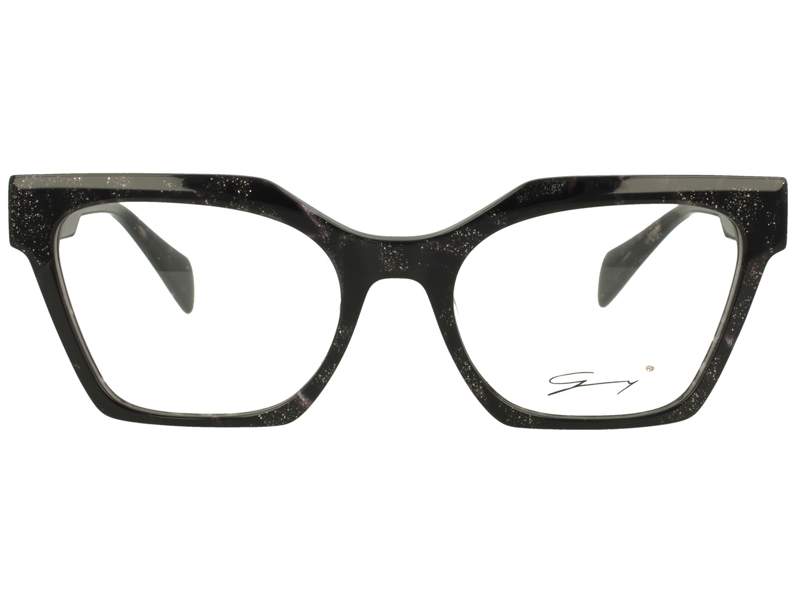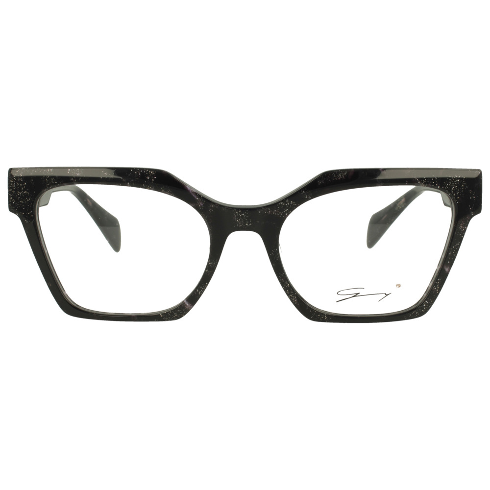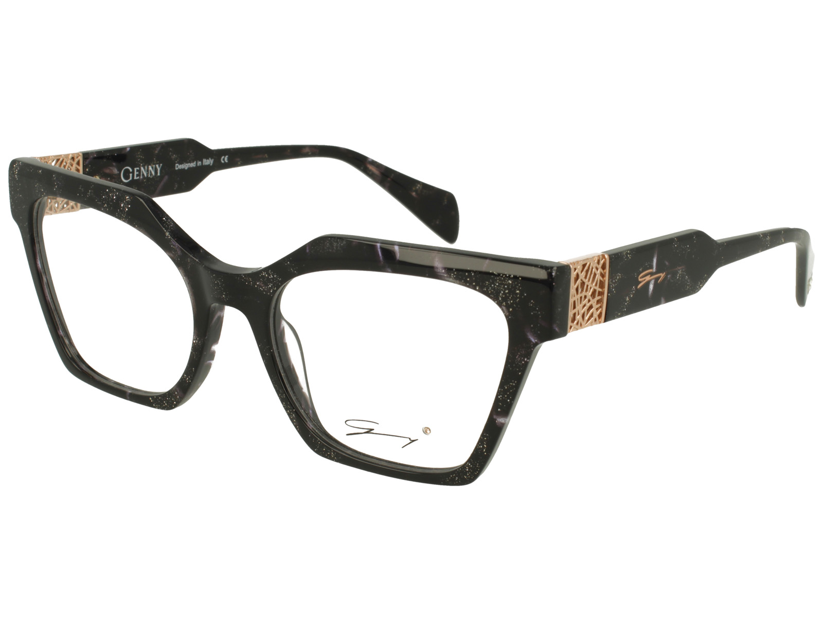 Genny gyv452 01 è un occhiale da vista con montatura squadrata in acetato, proposta in una tonalità nera intensa arricchita da leggere inclusioni luminose che creano un effetto puntinato sofisticato. Il frontale ampio da calibro 54 e il ponte da 19 mm definiscono una presenza decisa, con linee geometriche nette e profilo spesso. Le lenti demo sono trasparenti, pensate per essere sostituite con lenti correttive personalizzate. Sulle aste spiccano inserti metallici color oro con lavorazione traforata, posizionati in prossimità delle cerniere, che aggiungono profondità e contrasto al design. Più indietro compare il monogramma genny in finitura dorata, mentre all’interno dell’asta è visibile il logo del brand con la dicitura designed in italy. Un modello che combina volumi marcati, dettagli decorativi e una costruzione visibilmente ricca di personalità.