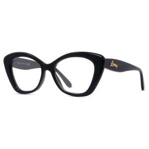 Loewe lw50067i 001 è un occhiale da vista dalla montatura cat-eye in nero lucido, costruita con volumi pieni e profili scolpiti che accentuano la linea rialzata agli angoli esterni. Il frontale presenta una silhouette ampia e decisa, con cerchi sfaccettati che donano profondità al design e mettono in risalto l’andamento sinuoso del ponte. Le lenti demo trasparenti mantengono pulita la lettura della forma, lasciando emergere con chiarezza il lavoro sulla montatura. Sulle aste spesse, leggermente rastremate verso i terminali, spicca il logo loewe in metallo color oro applicato in rilievo, dettaglio ben visibile che crea un contrasto netto con il nero del frame. La misura con calibro 52 e ponte 17 contribuisce a un equilibrio visivo studiato, ideale per chi cerca un modello ottico con forte identità grafica e presenza frontale marcata.