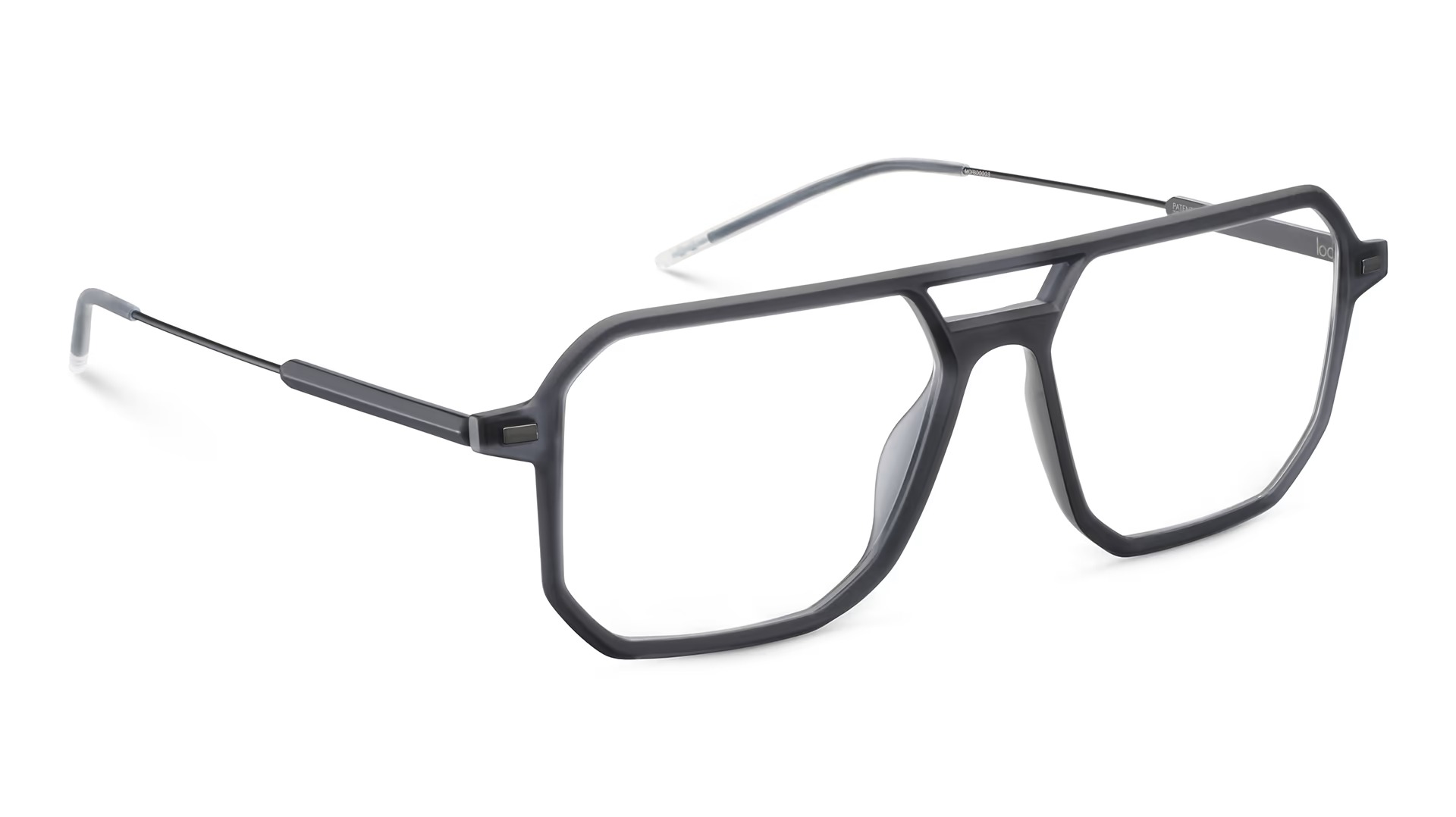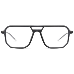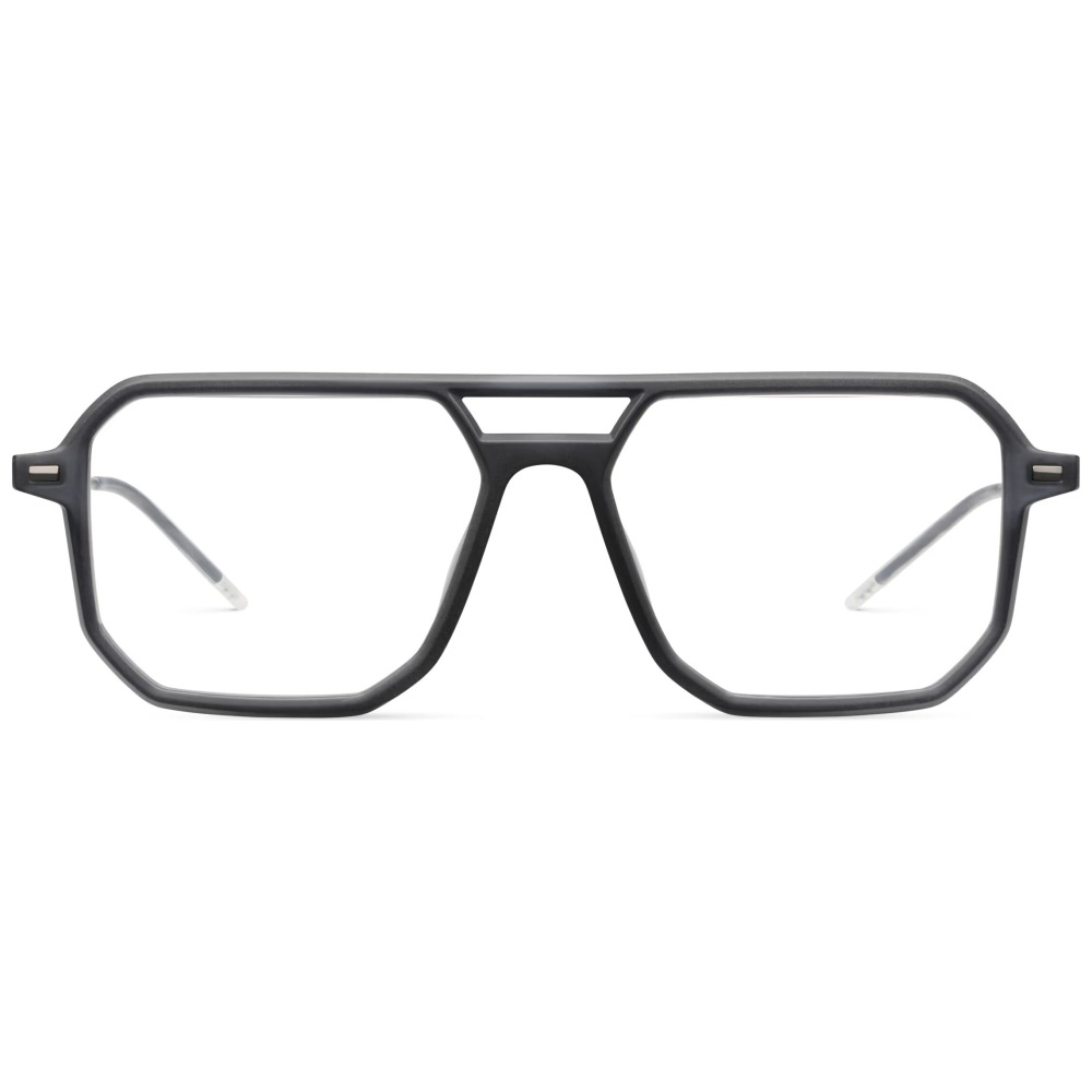 Lool torx 54o bk è un occhiale da vista dalla montatura squadrata con profilo geometrico deciso e finitura nera opaca. Il frontale si distingue per la costruzione sfaccettata, con lenti ampie e un ponte scolpito che crea un gioco architettonico nella parte superiore centrale. Le lenti in demo sono trasparenti, pensate per il montaggio di lenti oftalmiche personalizzate. Le aste combinano una sezione iniziale più strutturata con terminali sottili in metallo, completati da appoggi traslucidi chiari che alleggeriscono visivamente il design. Sul lato esterno del frontale e sulle aste sono presenti piccoli inserti metallici rettangolari, mentre il logo lool compare in modo discreto nella parte interna vicino alla cerniera. Con calibro 54 e ponte 16, questo modello propone una presenza grafica marcata ma pulita, enfatizzata dalle linee tese del frontale e dalla costruzione leggera delle aste.