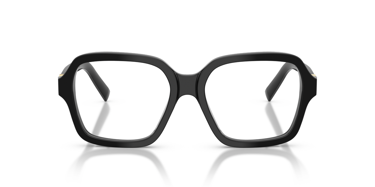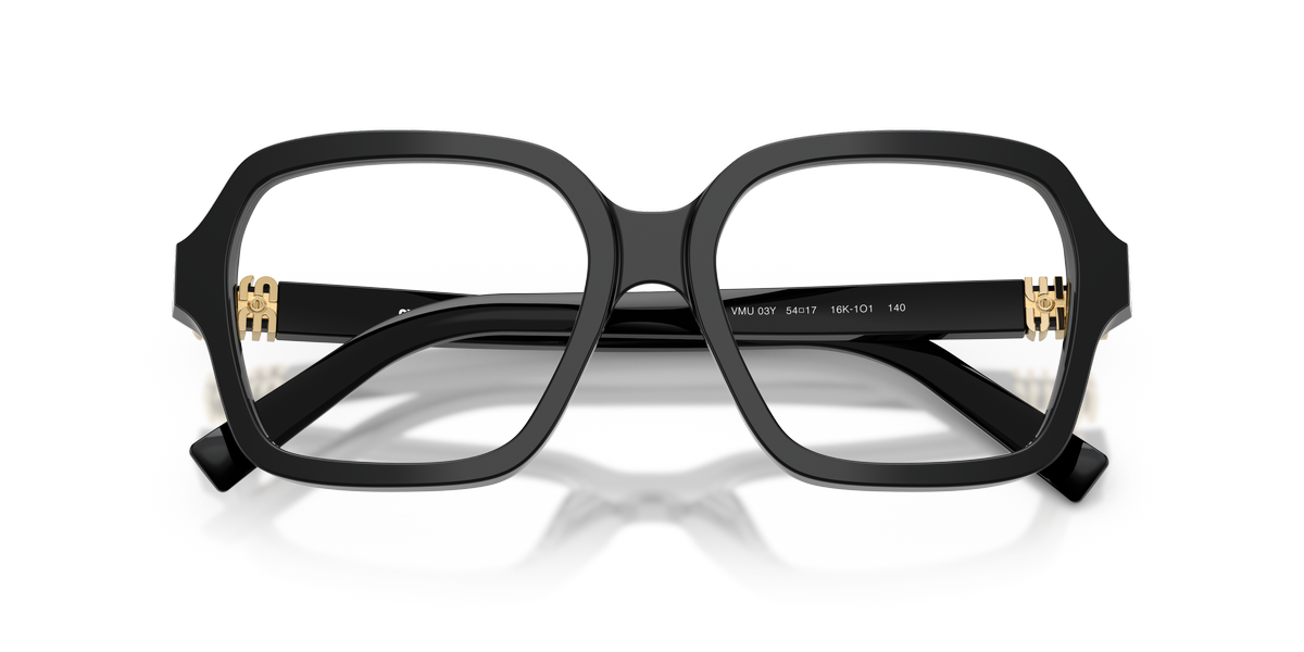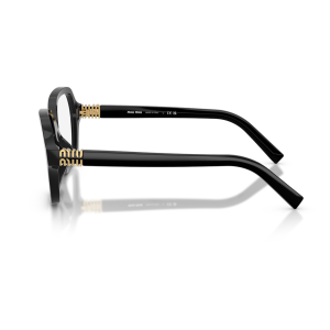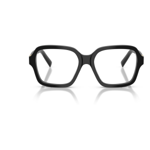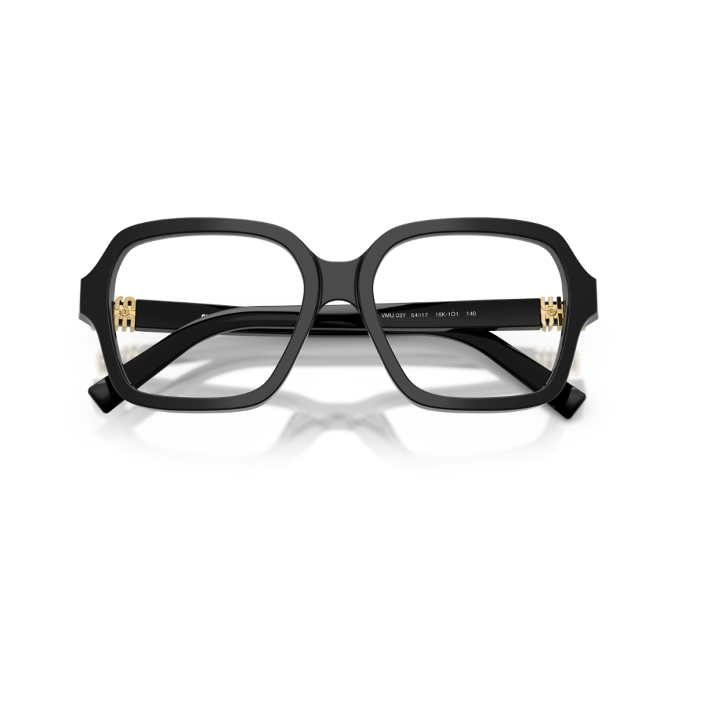 Miu miu 03yv vista 16k1o1 presenta una montatura squadrata in acetato nero dal profilo deciso e contemporaneo. Il frontale ampio, con linee geometriche leggermente ammorbidite agli angoli, valorizza lo sguardo e definisce un’estetica grafica ben riconoscibile. Le lenti demo trasparenti mettono in evidenza la struttura pulita del modello e ne sottolineano il carattere da vista. Sulle aste, il dettaglio distintivo è il logo miu miu in finitura oro, integrato vicino al frontale come elemento decorativo e identitario, con un effetto gioiello che crea contrasto con il nero lucido della montatura. Il ponte da 17 mm e il calibro 54 mm contribuiscono a una presenza importante sul viso, mantenendo proporzioni equilibrate. All’interno dell’asta compare la firma miu miu con le informazioni di produzione, in linea con l’impostazione curata e riconoscibile del modello.