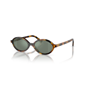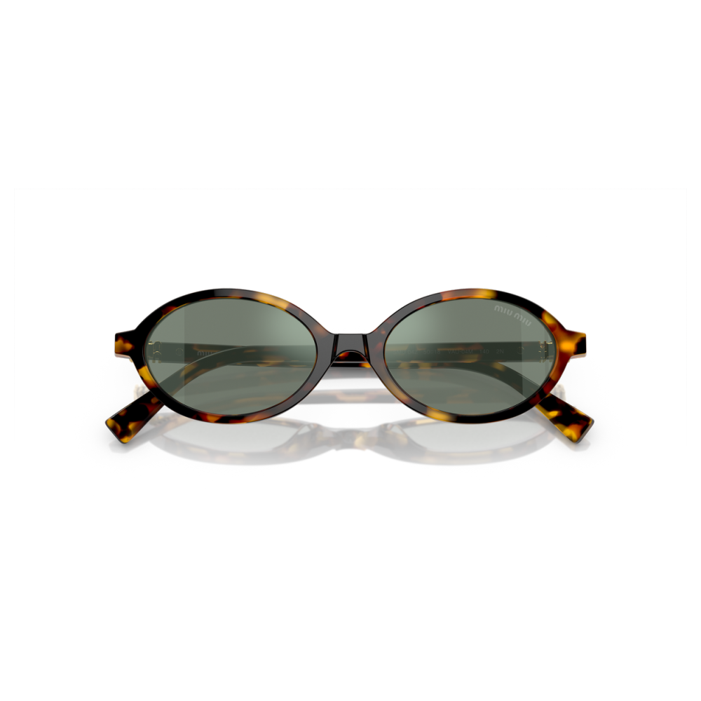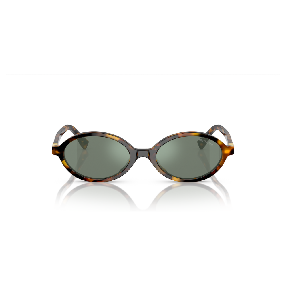 Miu miu 04zs sole è un occhiale da sole dalla montatura ovale in acetato, proposta in una tonalità tartarugata dai contrasti caldi tra miele, ambra e marrone scuro. Il frontale pieno segue linee morbide e compatte, con profilo sottile ma ben definito, mentre il ponte sagomato accompagna l’impostazione rétro del modello. Le lenti, in una nuance verde-grigio, aggiungono un effetto visivo sobrio e uniforme, bilanciando la ricchezza cromatica della montatura. Sulla lente destra compare il logo miu miu in piccolo, discreto ma ben visibile, mentre sulle aste spicca l’inserto metallico dorato con lettering verticale miu miu, integrato in prossimità del frontale come dettaglio distintivo. Con calibro 50 e ponte 18, questo modello unisce proporzioni compatte e costruzione curata, enfatizzando il carattere grafico della silhouette ovale.
