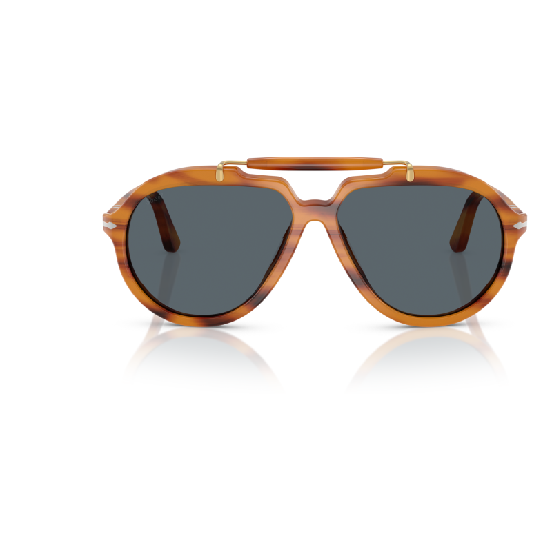 Persol 1025s sole 513/53 presenta una montatura rettangolare dal profilo sottile e lineare, pensata per un look pulito e deciso. Il frontale in metallo mostra una finitura grigio canna di fucile che sottolinea la geometria essenziale del modello, mentre le lenti in tonalità marrone chiaro donano un contrasto caldo e uniforme. La struttura in metallo è alleggerita da naselli regolabili trasparenti, che migliorano la vestibilità sul ponte da 22 mm. Le aste sottili riprendono il tono freddo del frontale e si completano con terminali sfumati dall’effetto tartarugato trasparente, dettaglio che aggiunge profondità visiva al design. Sull’asta è presente il logo persol, discreto ma ben leggibile, inserito vicino all’interno della struttura. Il calibro da 54 mm contribuisce a un’impostazione equilibrata, con una copertura ampia ma ordinata sul viso.