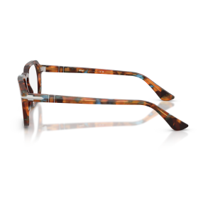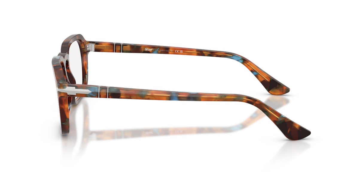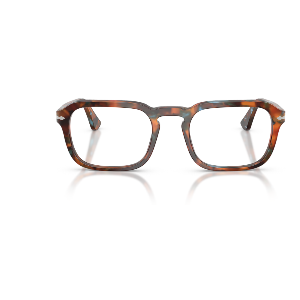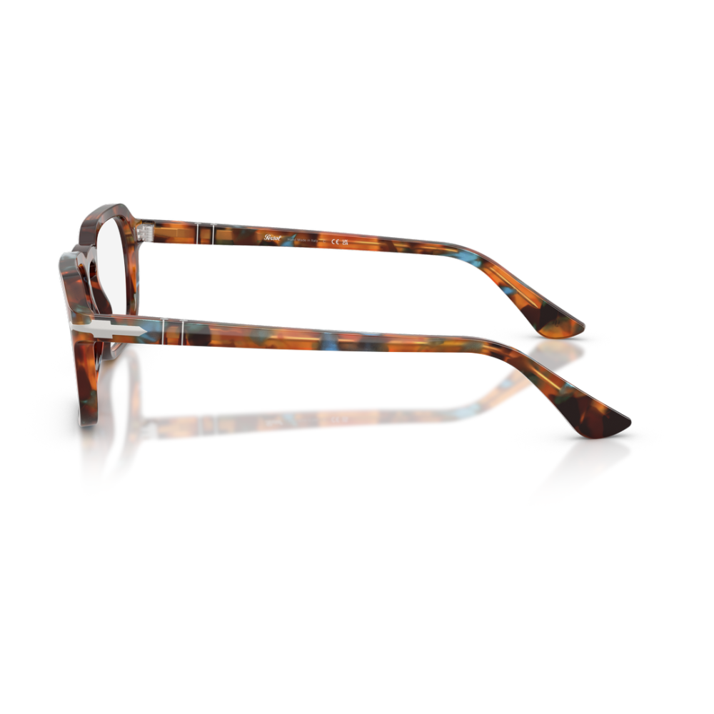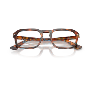 Persol 3390v vista è un occhiale da vista con montatura squadrata in acetato, caratterizzato da un motivo tartarugato multitonale che unisce sfumature calde del marrone a tocchi più freddi e traslucidi. Il frontale pieno ha linee marcate ma ben bilanciate, con ponte sagomato che rafforza il carattere deciso del modello senza appesantirne il profilo. Le lenti demo trasparenti mettono in evidenza la struttura del frontale e lasciano risaltare la lavorazione cromatica dell’acetato. Sulle aste spicca l’iconica freccia persol in metallo, inserita vicino al frontale come dettaglio distintivo del brand, mentre la costruzione complessiva mantiene un look compatto e contemporaneo. Con calibro 52 e ponte 21, questo modello interpreta il linguaggio persol con una presenza visiva netta e una silhouette ampia, pensata per chi cerca una montatura da vista riconoscibile e strutturata.