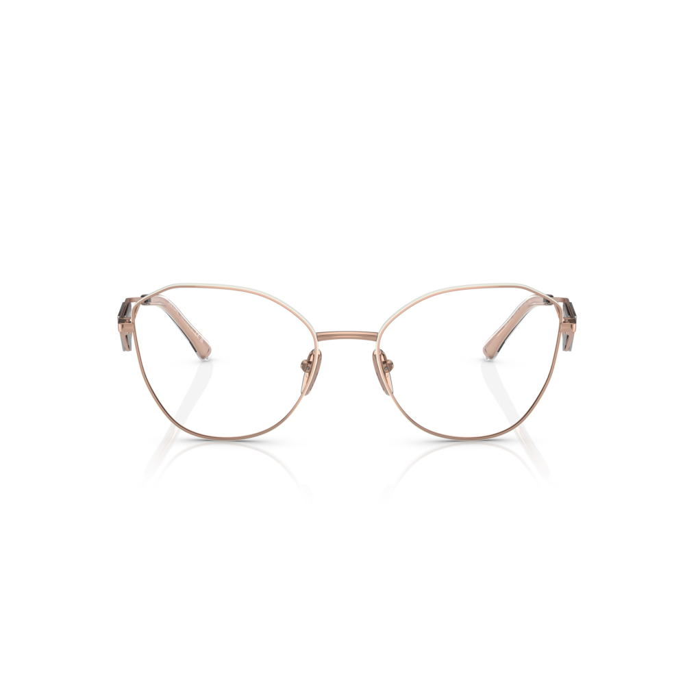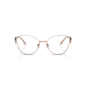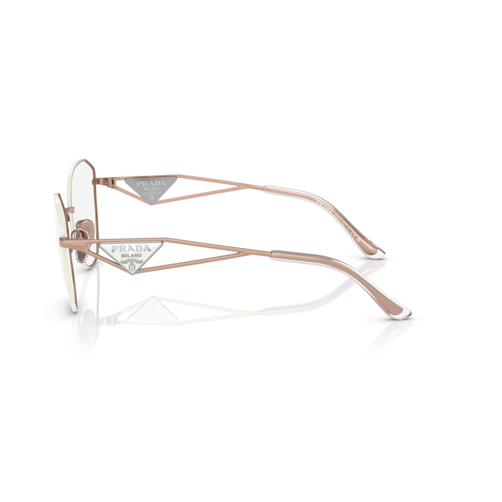 Prada 52zv vista è un occhiale da vista con montatura squadrata in tonalità rosa metallico, caratterizzato da un profilo sottile e geometrico che alleggerisce il frontale. La struttura in acciaio valorizza il design con linee pulite, ponte lineare e naselli regolabili che rendono il modello visivamente essenziale ma molto costruito. Le lenti demo trasparenti lasciano risaltare il lavoro sulle aste, dove il dettaglio più distintivo è l’inserto triangolare aperto vicino al frontale, arricchito dal logo prada milano visibile all’interno. Anche i terminali mantengono la stessa palette chiara e delicata, con una finitura traslucida che accompagna il metallo rosa della montatura. Il calibro 55 e il ponte 18 definiscono proporzioni ampie e ben bilanciate, ideali per chi cerca un occhiale da vista leggero con un’identità grafica precisa e riconoscibile.