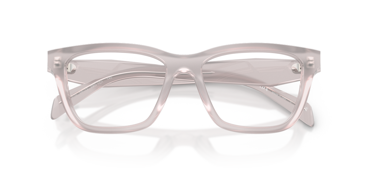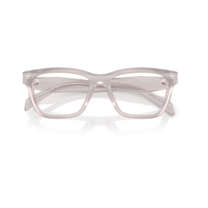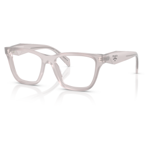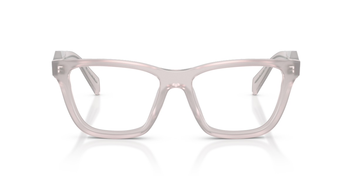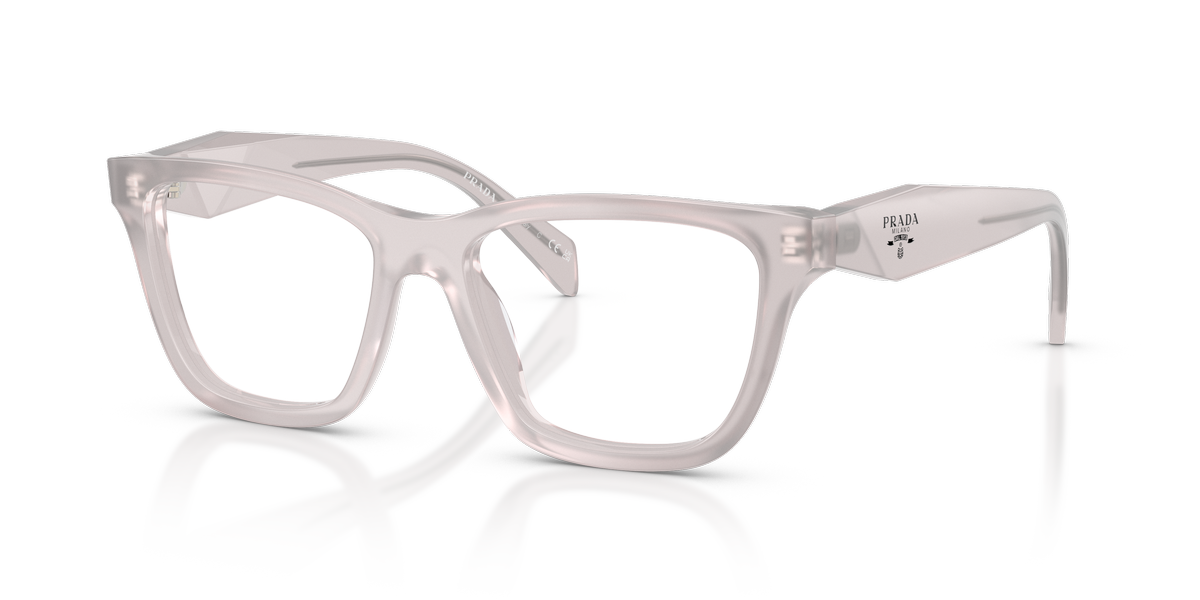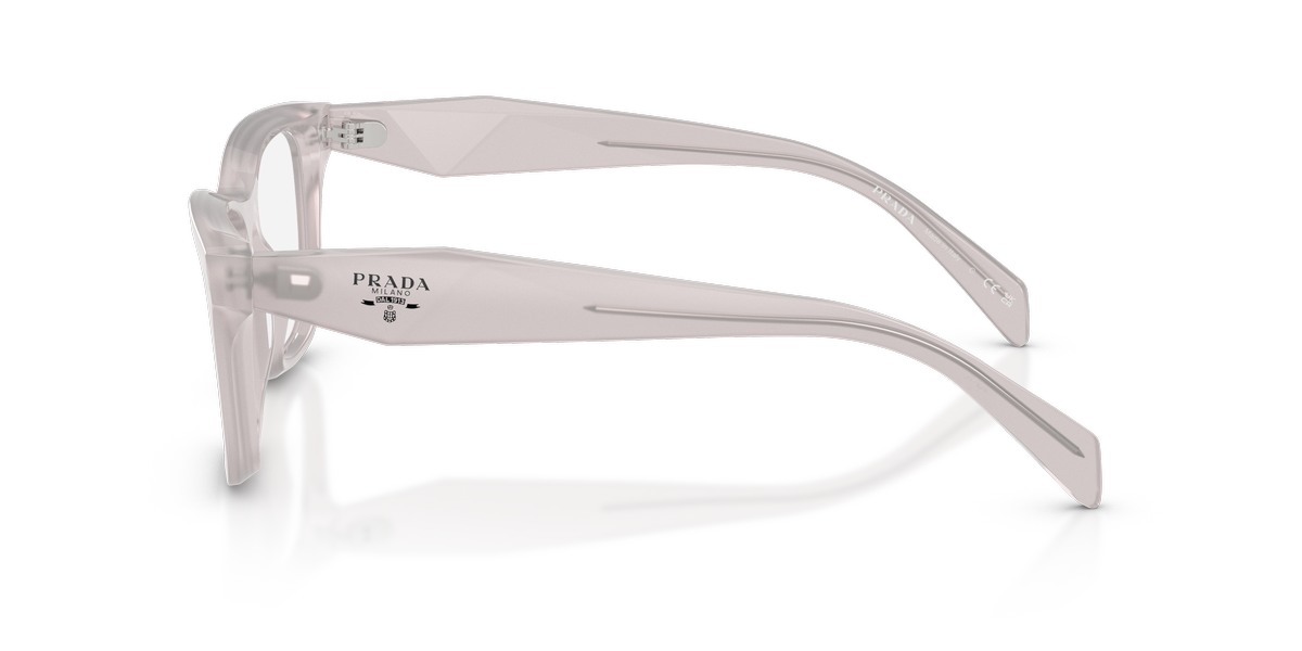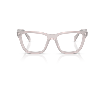 Prada c10v vista 29g1o1 presenta una montatura squadrata dal profilo deciso, realizzata in acetato trasparente con una tonalità chiara lattiginosa che illumina il frontale e mette in risalto i volumi pieni del design. Le lenti demo hanno colore trasparente, in linea con la destinazione da vista del modello e con l’estetica pulita dell’insieme. Il frontale è ampio, con angoli morbidi e ponte scolpito, mentre le aste spesse seguono la stessa finitura semitrasparente creando continuità visiva tra parte frontale e laterali. Sulla sezione esterna delle aste compare il logo prada milano, stampato in nero, accompagnato dal piccolo stemma triangolare che richiama i codici iconici della maison. Il calibro 52 e il ponte 17 contribuiscono a una calzata equilibrata, valorizzando una silhouette contemporanea e strutturata.