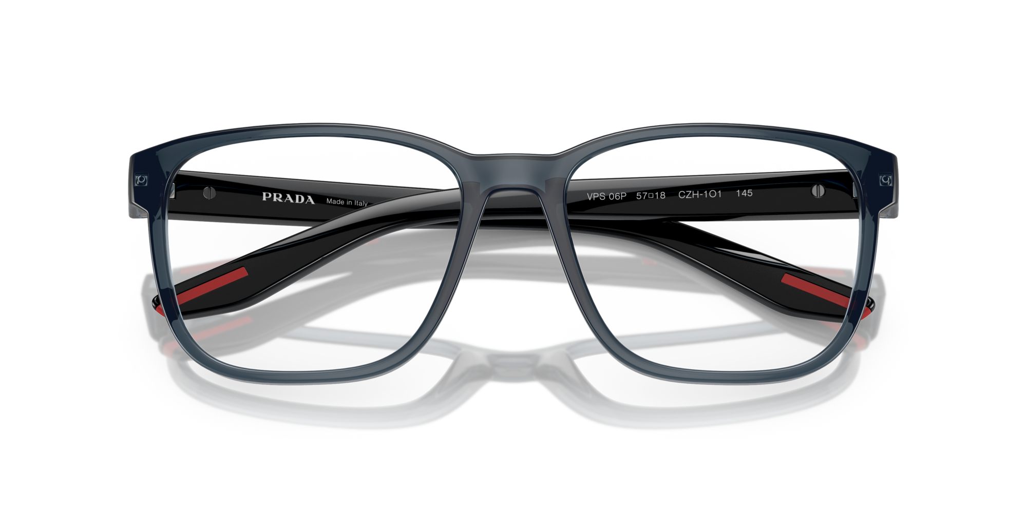 Prada linea rossa 06pv vista czh1o1 è un occhiale da vista con montatura rettangolare ampia, proposta in una tonalità blu trasparente dal carattere tecnico e contemporaneo. La struttura in propionato alleggerisce il profilo e valorizza le linee morbide del frontale, con ponte sagomato e volumi ben definiti. Le lenti demo sono trasparenti, pensate per essere sostituite con lenti correttive personalizzate. Sulle aste spicca il dettaglio più riconoscibile del modello: l’inserto rosso prada con logo bianco a contrasto, elemento iconico della linea sport-inspired del marchio. La parte iniziale delle aste presenta inoltre una costruzione leggermente traslucida che lascia intravedere la cerniera, aggiungendo un accento tecnico al design. Il calibro 57 e il ponte 18 mm definiscono una vestibilità decisa, adatta a chi preferisce una presenza visiva marcata sul volto.