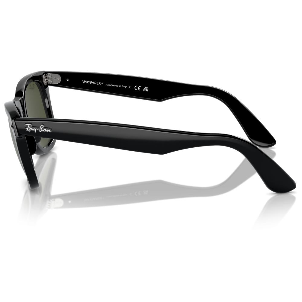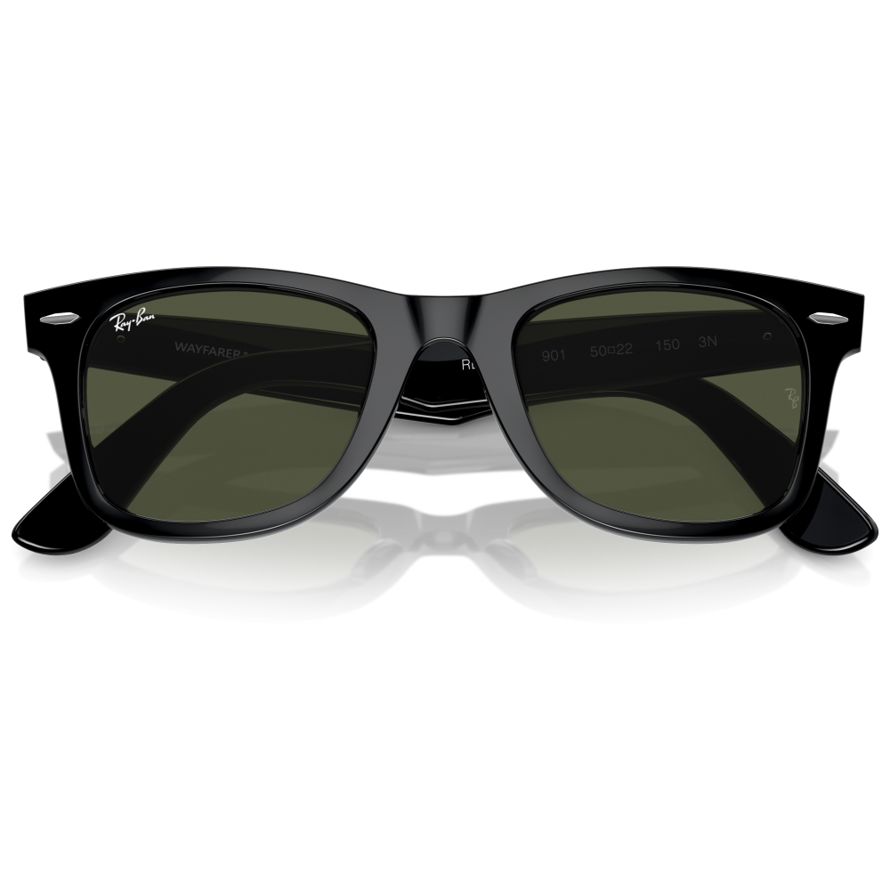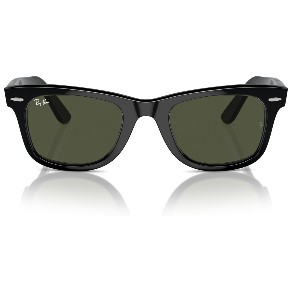 Ray-ban wayfarer original 2140 sole colore 901 riprende la silhouette iconica del brand con una montatura squadrata in acetato nero, dal frontale spesso e deciso. La costruzione con calibro 50 e ponte 22 mm mantiene le proporzioni classiche del modello, con linee nette e profilo inclinato che caratterizzano il wayfarer originale. Le lenti verdi g-15 completano il design con il look storico ray-ban e ospitano il logo ray-ban stampato sulla lente sinistra, mentre sulla lente destra compare il discreto monogramma rb inciso. Sul frontale spiccano i rivetti metallici in corrispondenza delle cerniere, dettaglio distintivo del modello, ripresi dal logo ray-ban applicato sulle aste larghe in finitura lucida. Un occhiale da sole dalla presenza forte, immediatamente riconoscibile per volumi, inclinazione del frontale e dettagli signature della casa.