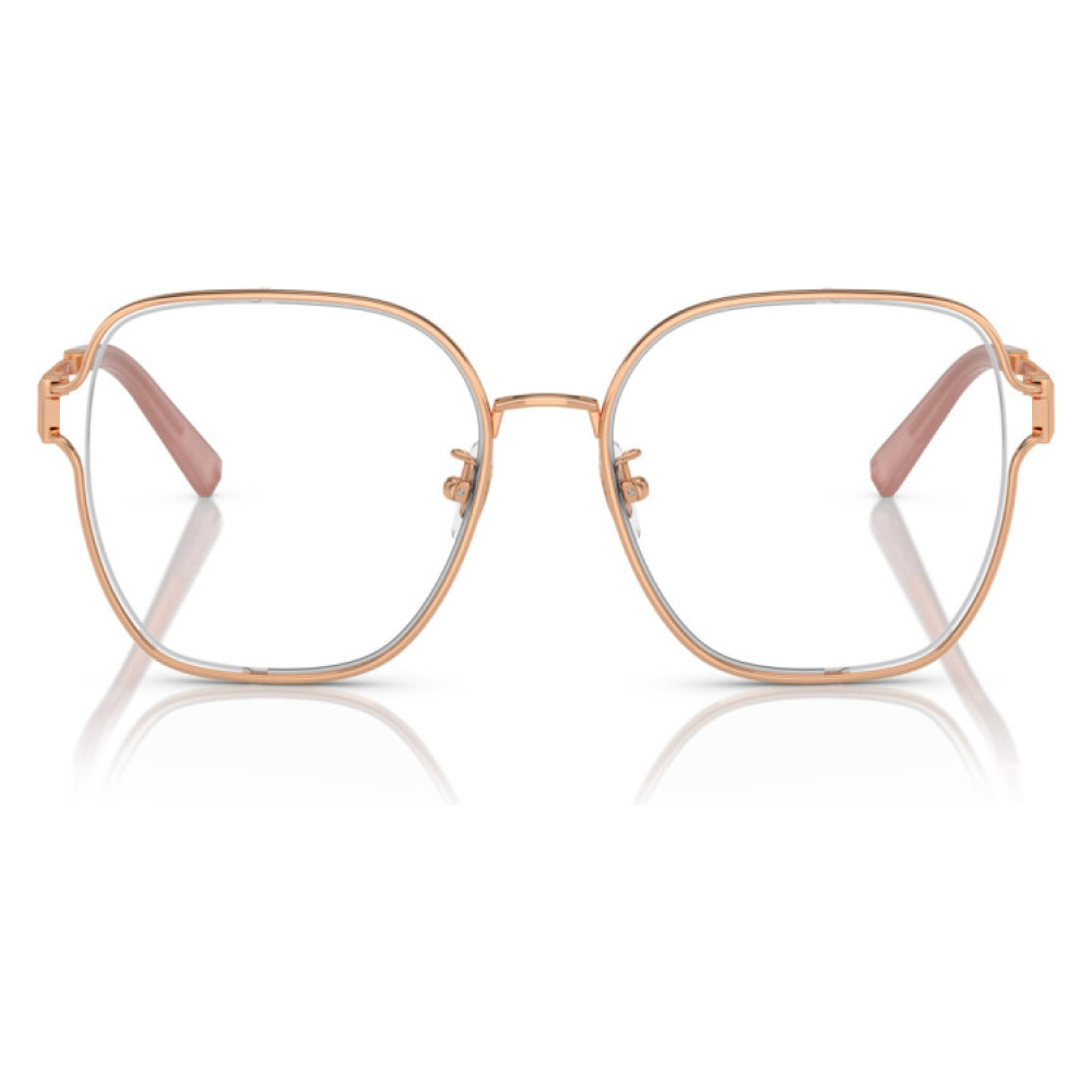 Tiffany & co. 1155d vista 6105 è un occhiale da vista con montatura squadrata in metallo dal profilo sottile e leggero, proposta in una tonalità oro calda e luminosa. Il frontale ampio, con angoli delicatamente smussati, disegna una linea decisa ma ariosa, valorizzata dal ponte sottile e dai naselli regolabili. Le lenti demo trasparenti mantengono l’aspetto pulito del modello e mettono in evidenza la costruzione essenziale della montatura. Le aste in metallo riprendono la finitura dorata del frontale e si completano con terminali rosa cipria, che introducono un contrasto morbido e distintivo. Sulla parte interna dell’asta è presente la firma tiffany & co., mentre la cerniera lineare si integra con discrezione nel disegno complessivo. Le misure calibro 55 e ponte 17 rendono questo modello equilibrato nelle proporzioni, con una presenza visiva definita ma leggera.